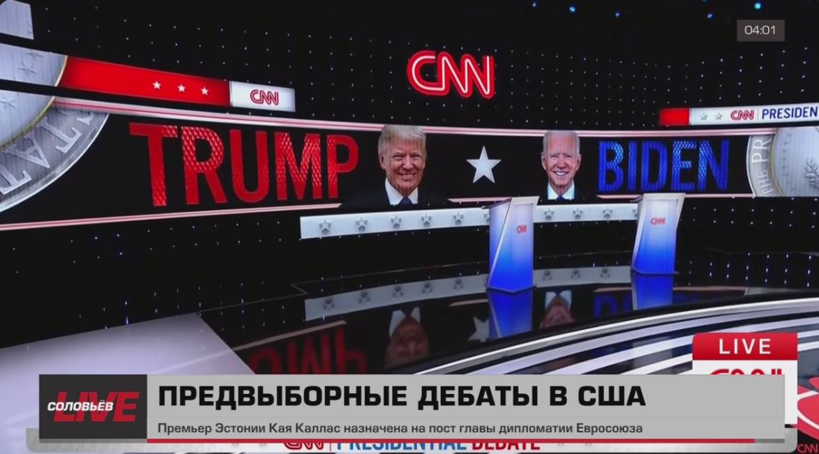 🇺🇸 Смотрите в прямом эфире СоловьёвLive дебаты бывшего и нынешнего президентов США Дональда Трампа и Джо Байдена.