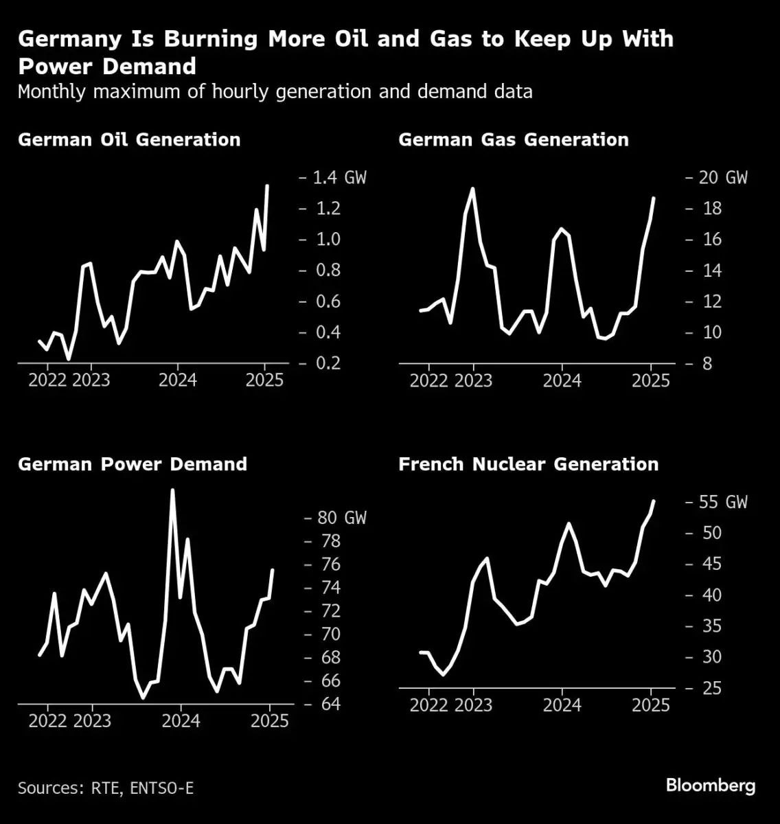 ✔️Производство электроэнергии из нефти в Германии выросло до самого высокого уровня как минимум с 2017 года — из-за перебоев в работе возобновляемых источников энергии зимой, сообщает Bloomberg.