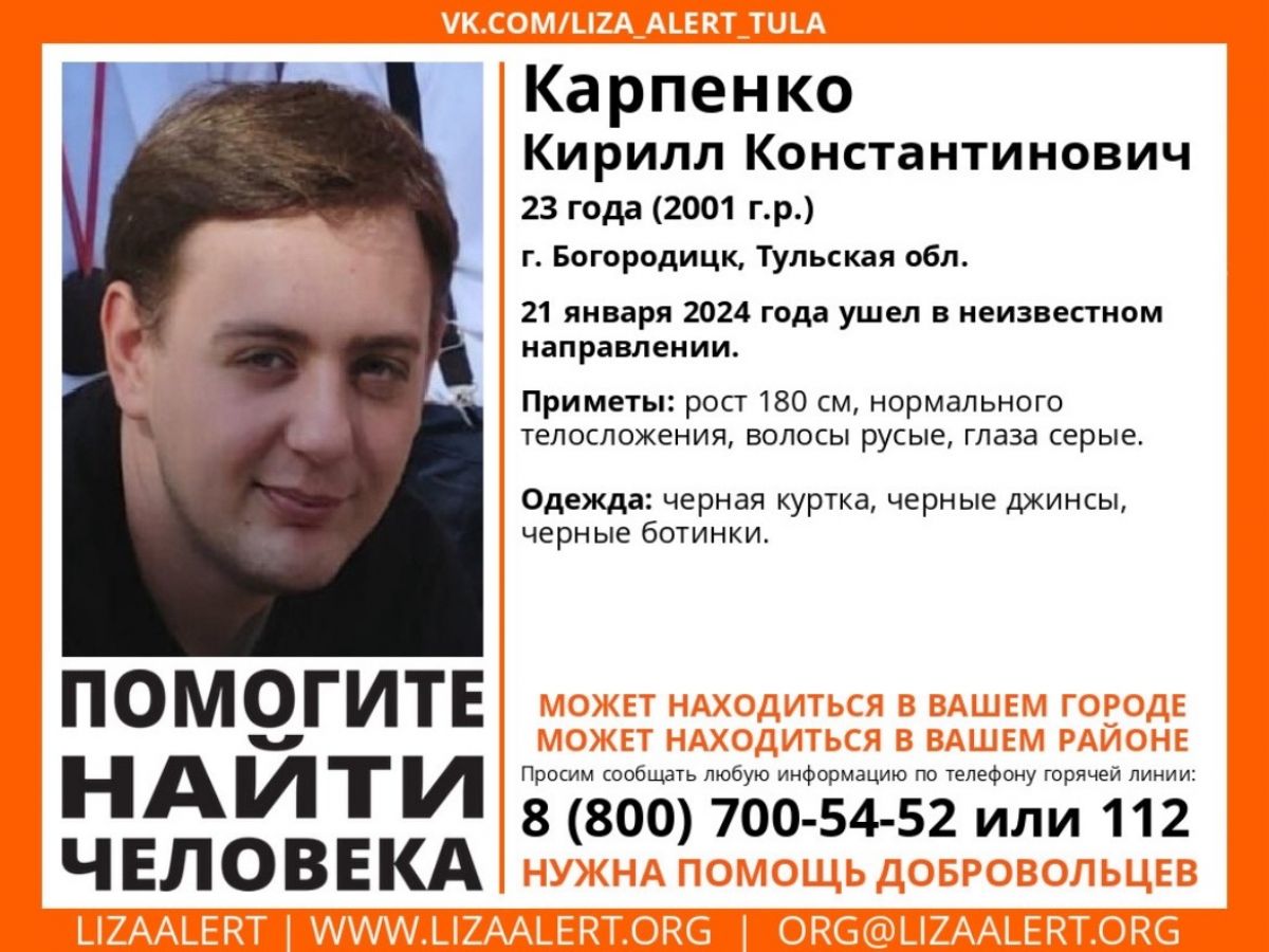 В Тульской области правоохранители и поисковый отряд «ЛизаАлерт» разыскивают 23-летнего молодого человека из Богородицка.