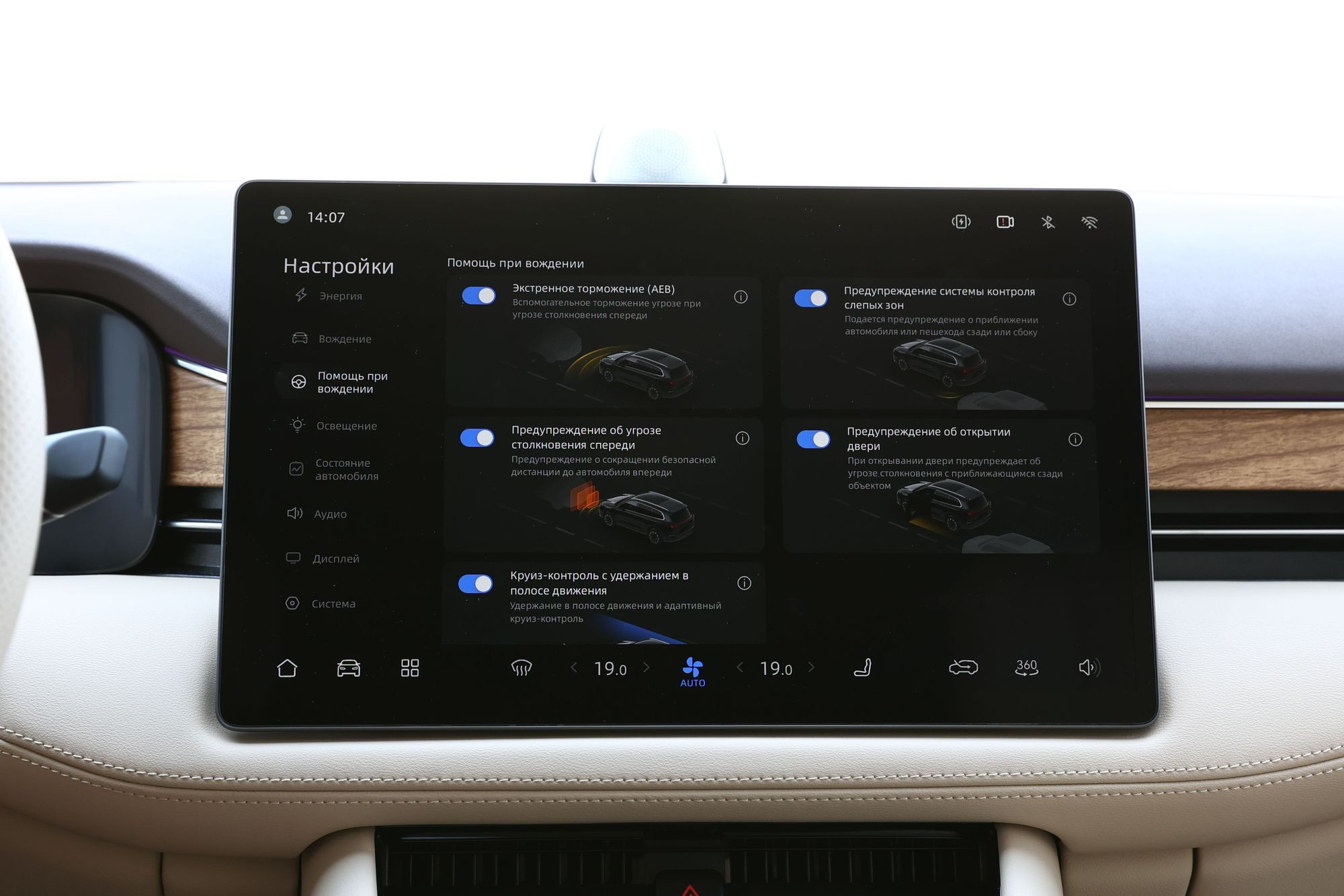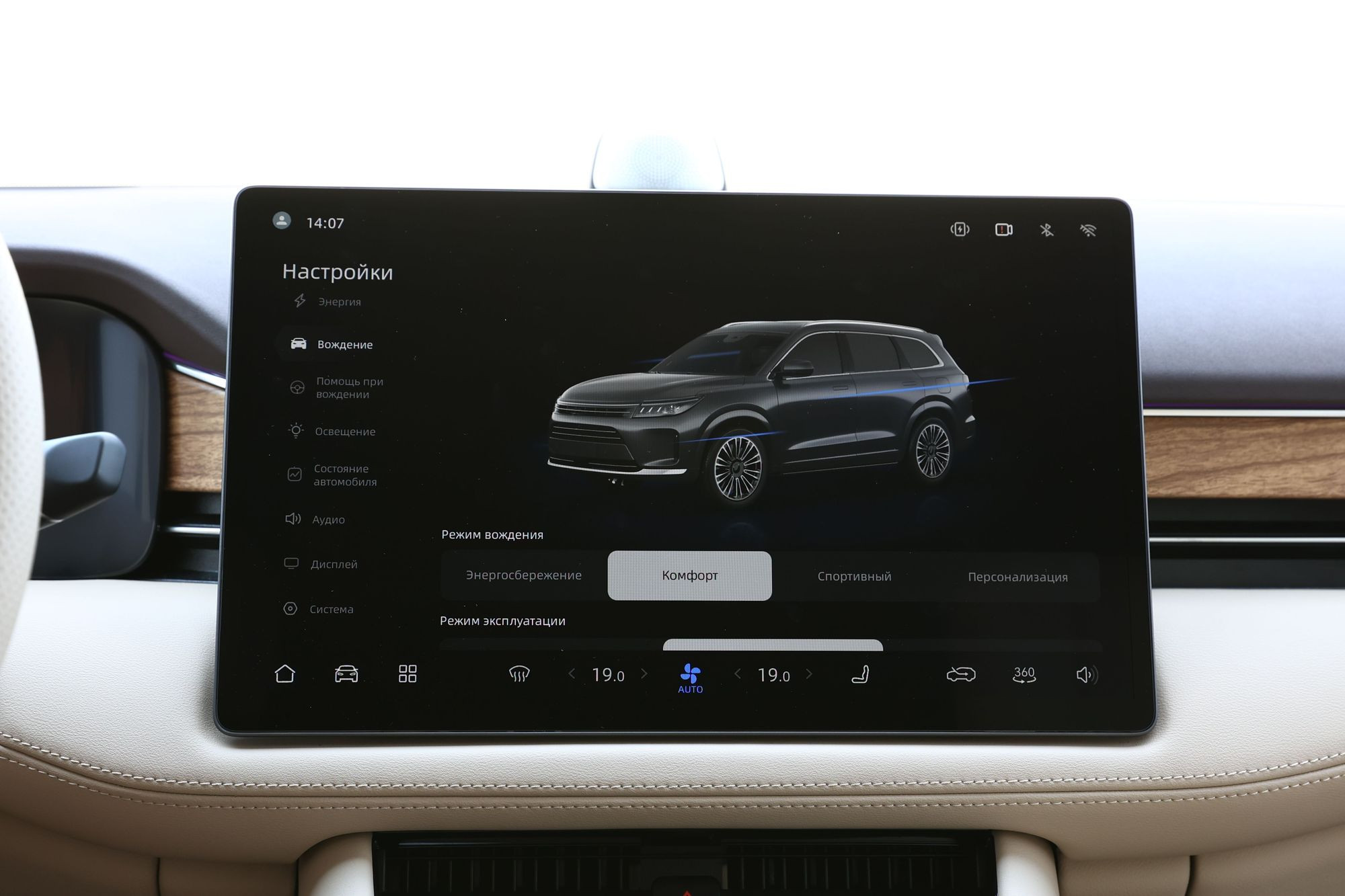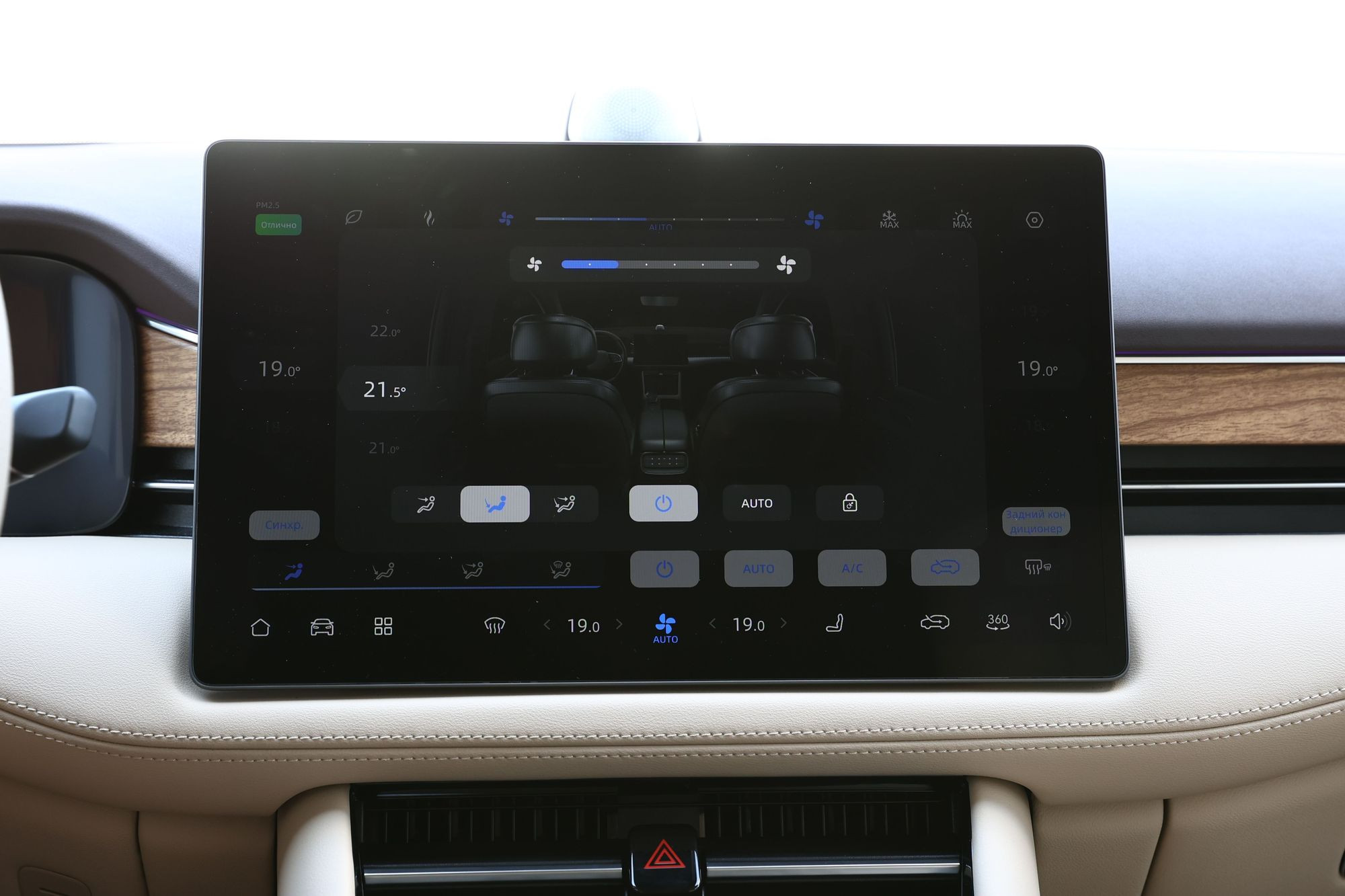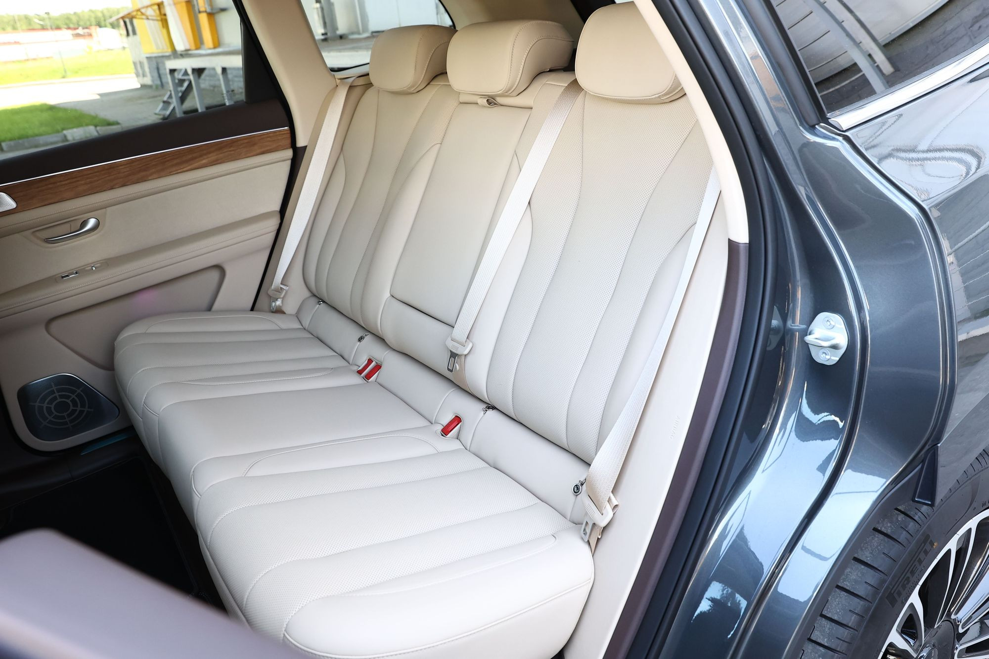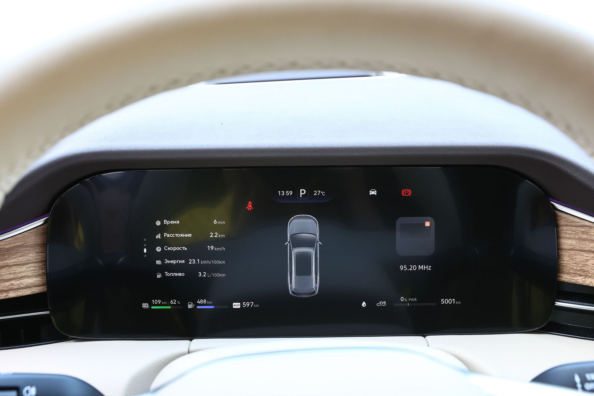 Разумеется, второй ряд у пятиместной версии гораздо просторнее, чем у трёхрядной «семёрки», а сзади могут разместиться трое – простора на уровне плеч более чем достаточно. Здесь есть подогревы крайних мест, вентиляция, массаж, собственная зона климата, разъёмы USB. В общем, всё что нужно. Нет разве что раскладных столиков и дисплеев. Мультимедийная система радует качественным переводом, 15,6-дюймовый центральный экран – шустрым откликом на касания и чёткостью картинки. А вот 10,25-дюймовая приборная панель по-китайски бесполезна, и что-то дельное там можно увидеть только на левой трети экрана.