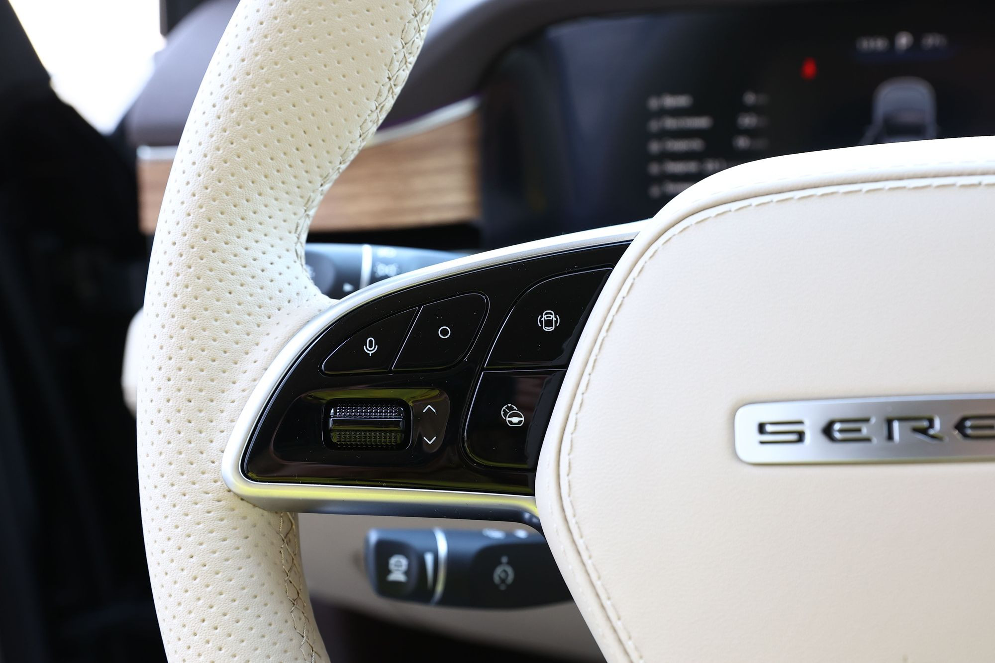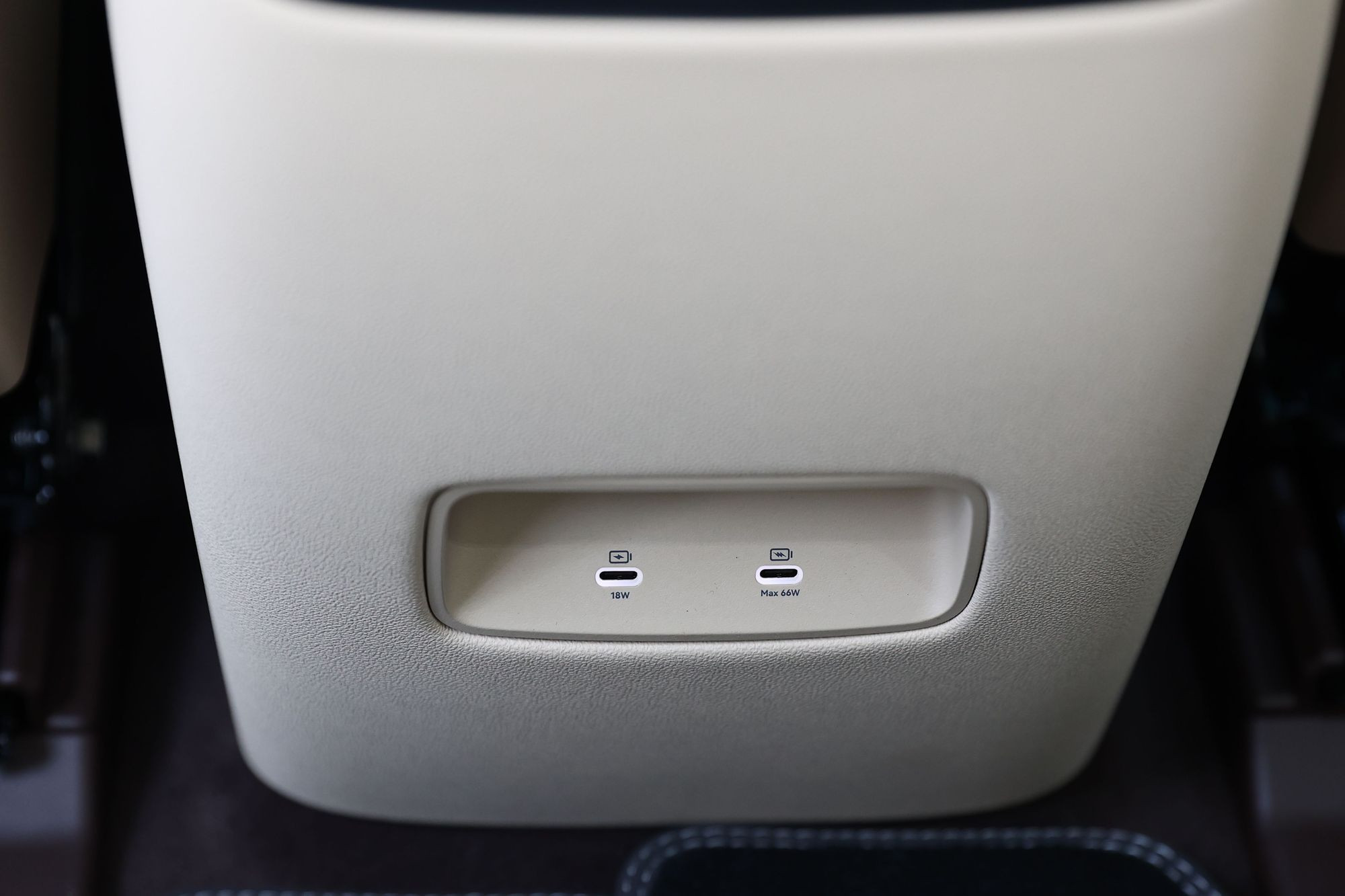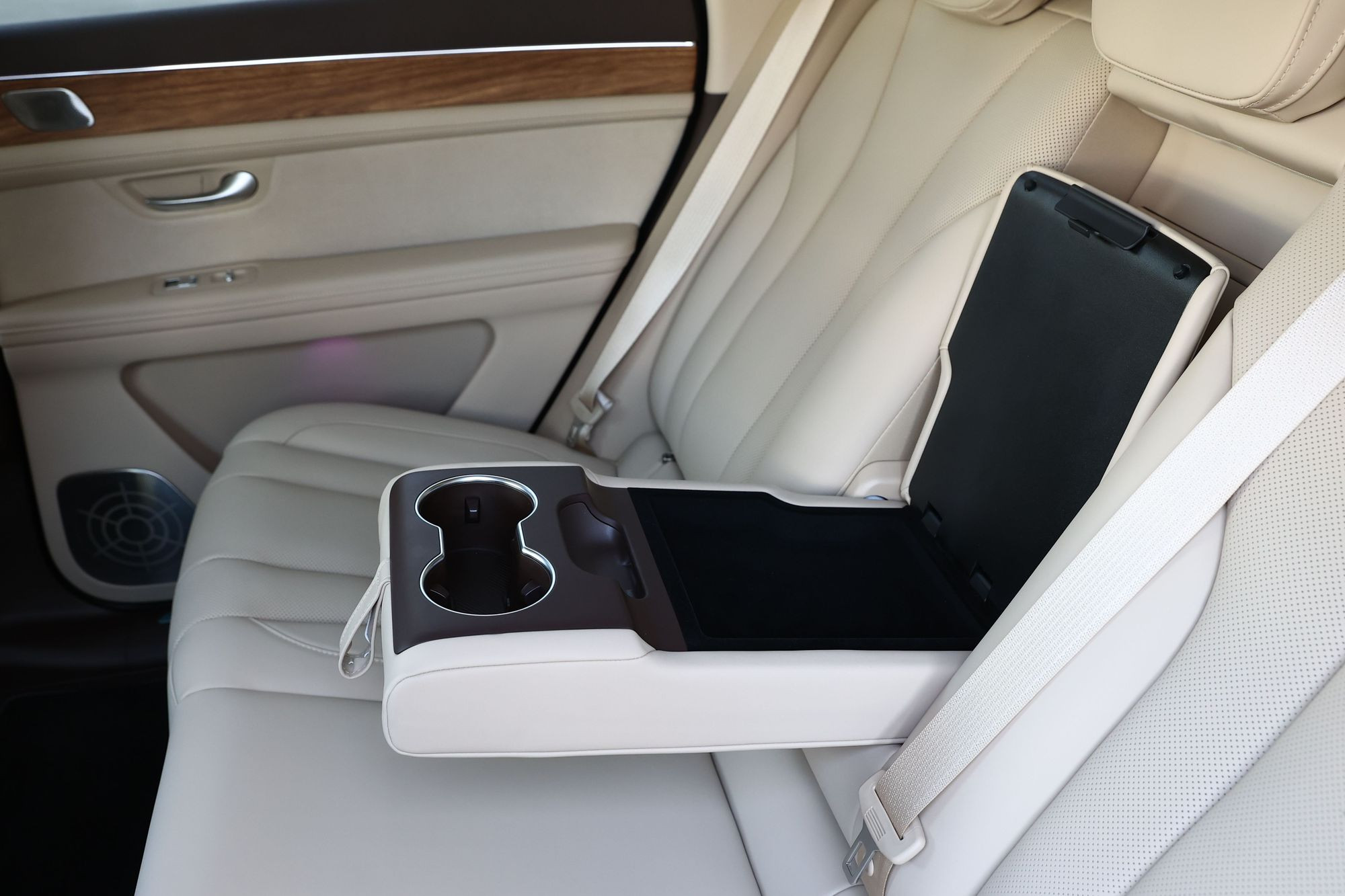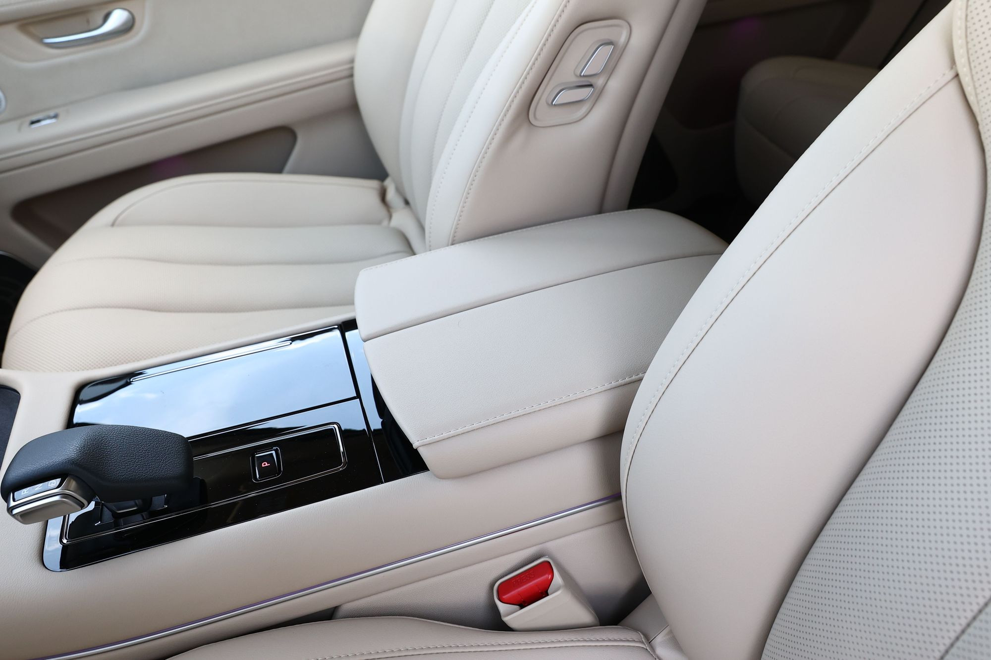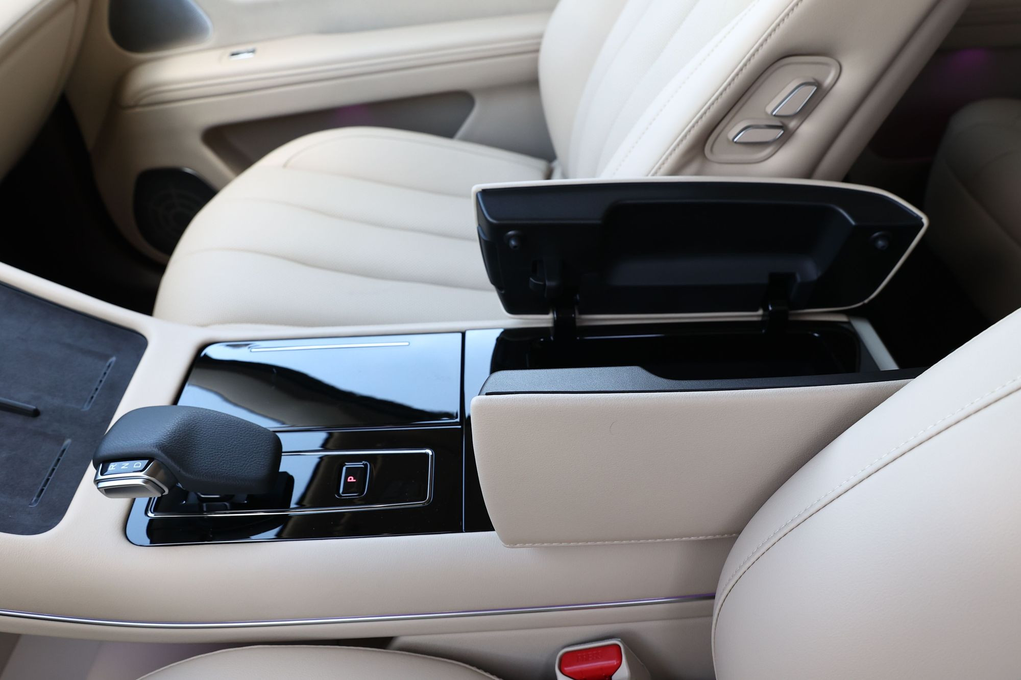 Разумеется, второй ряд у пятиместной версии гораздо просторнее, чем у трёхрядной «семёрки», а сзади могут разместиться трое – простора на уровне плеч более чем достаточно. Здесь есть подогревы крайних мест, вентиляция, массаж, собственная зона климата, разъёмы USB. В общем, всё что нужно. Нет разве что раскладных столиков и дисплеев. Мультимедийная система радует качественным переводом, 15,6-дюймовый центральный экран – шустрым откликом на касания и чёткостью картинки. А вот 10,25-дюймовая приборная панель по-китайски бесполезна, и что-то дельное там можно увидеть только на левой трети экрана.