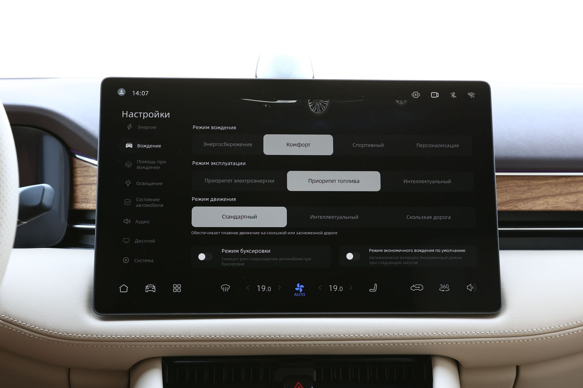 Кроме отзывчивости силовой установки и остроты педали тока, можно выбрать режим эксплуатации: «Приоритет электроэнергии», «Приоритет топлива» и «Интеллектуальный». Тут тоже всё понятно – как у любого гибрида, можно выбирать, насколько часто будет запускаться бензиновый мотор. Полностью вычеркнуть его из этой схемы нельзя: не зря речь идёт именно о приоритете того или иного источника питания. Просто если в одном случае электроника будет в первую очередь разряжать батарею, то в другом, наоборот, попытается сберечь её заряд и чаще сжигать топливо.