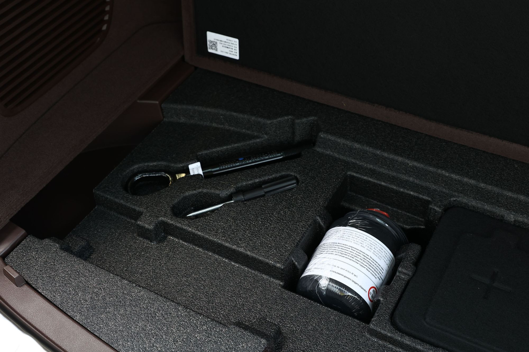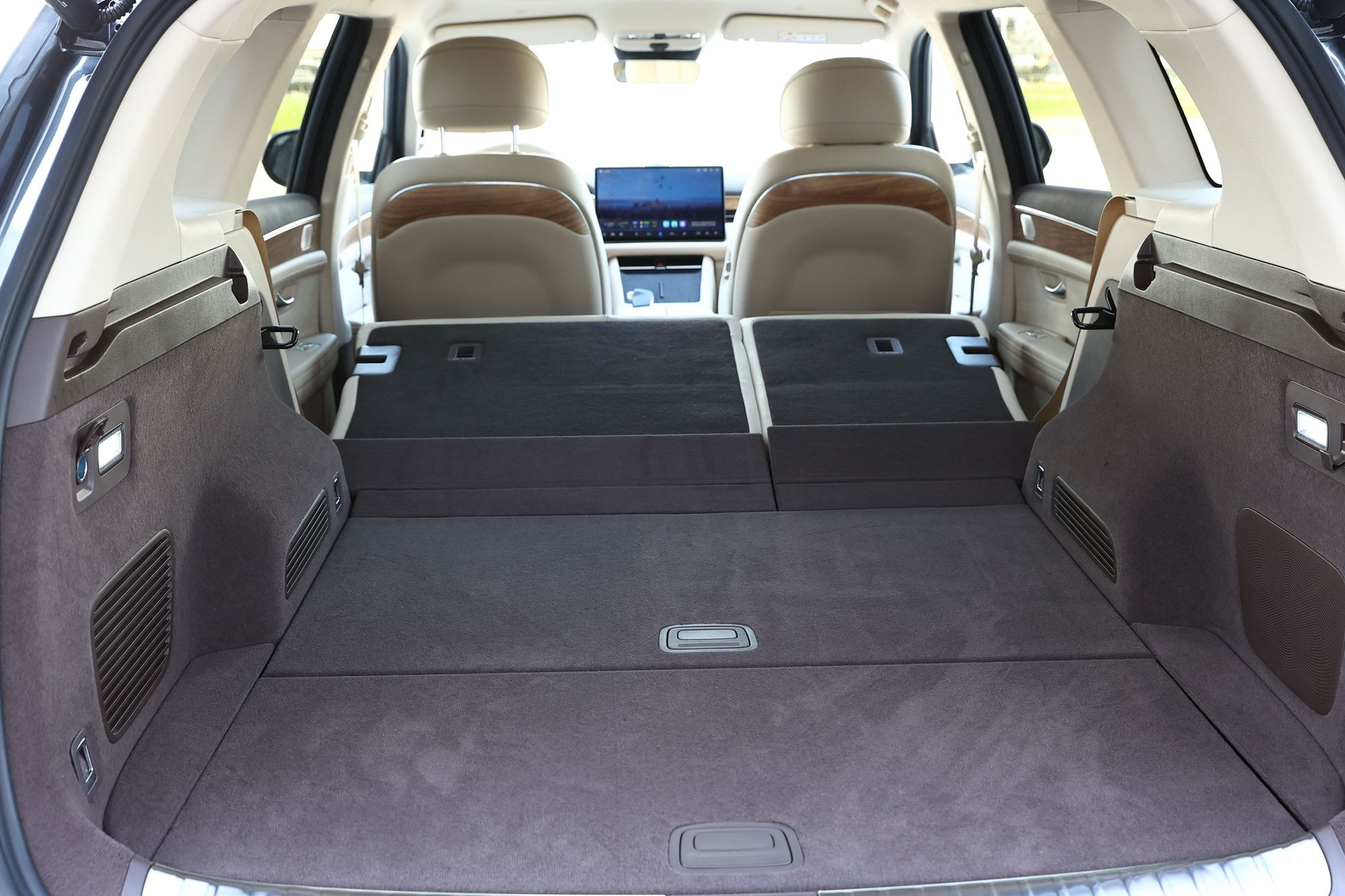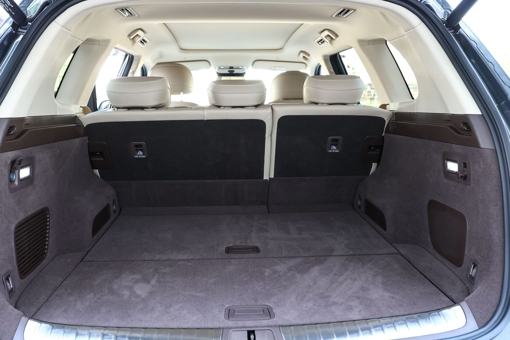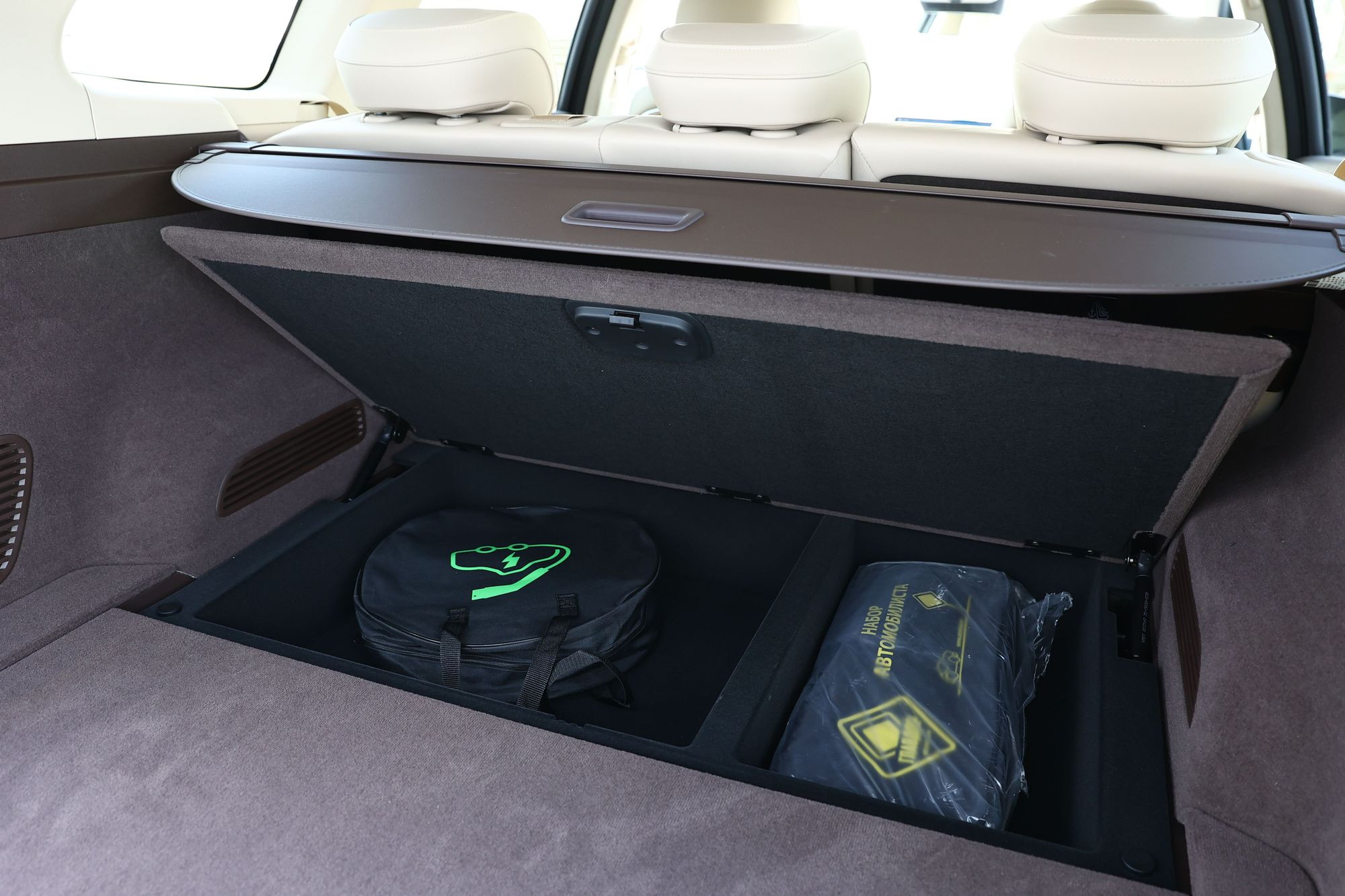 Багажник у пятиместной версии, разумеется, гигантский – 686 литров, а со сложенным вторым рядом – все 1619 литров. В подполье есть не один, а два полноценных отсека. Один – с зарядным устройством и «набором автомобилиста», второй – с проушиной, домкратом и прочими штатными инструментами. Наверное, единственная претензия здесь – внезапно малый угол подъёма багажной двери. С ростом 180 см мне приходилось быть осторожным: её кромка находится аккурат напротив лба, и это опасно.