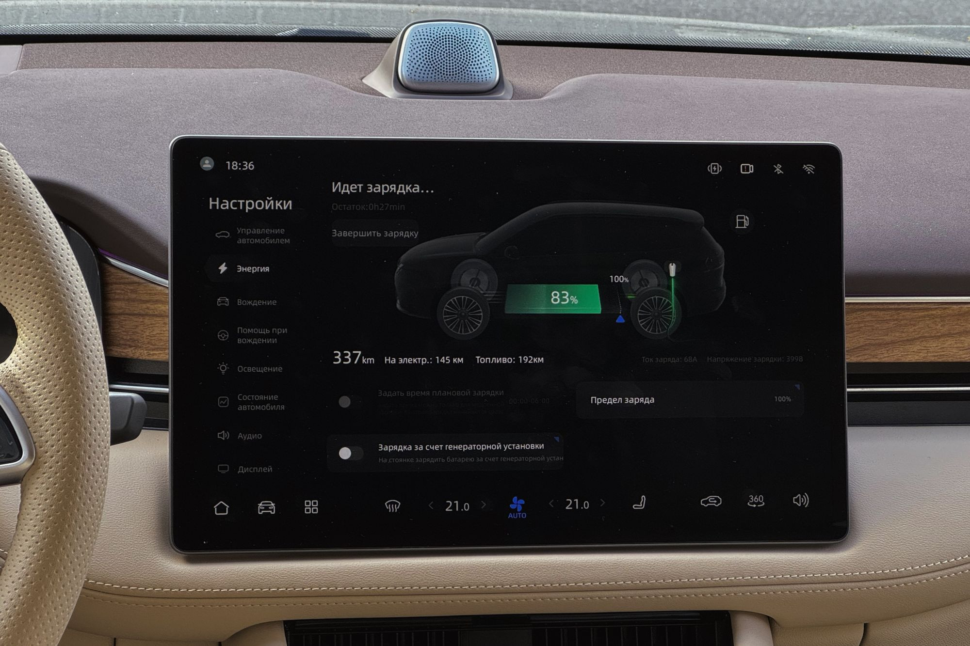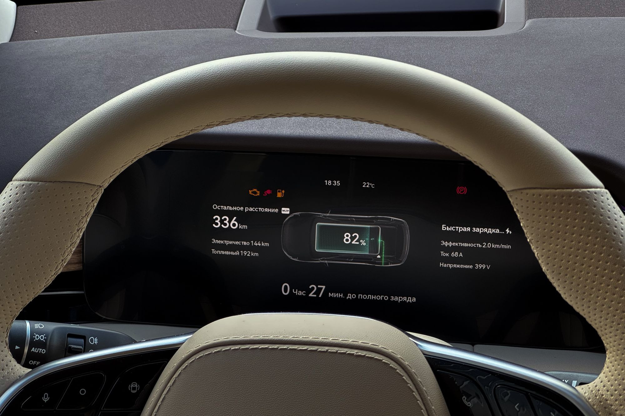 ДВС, к слову, почти всегда работает только на ходу, а на стоянке или даже при коротких остановках, например, на светофоре, он глохнет. По большому счёту, понять это можно только по анимации на дисплее – мотор не выдаёт себя ни звуком, ни вибрацией. И вообще, шумоизоляция у «семёрки» первоклассная – посторонние звуки с улицы до ушей пассажиров не добираются. Частота запуска двигателя зависит ещё и от текущего уровня заряда батареи, и чем он ниже, тем старательнее электроника жжёт бензин.
