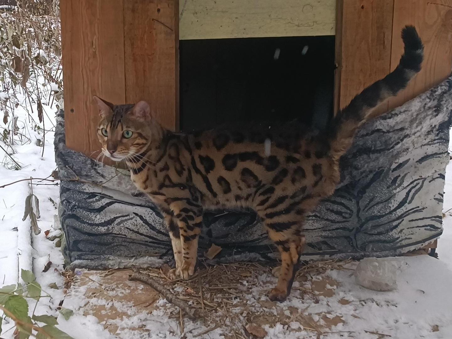 Кот сидит в будке, которую кто-то утеплил тканью. Откуда он там появился, женщина не знает. Судя по фото и видео, кот может быть породистым — он очень похож на бенгальского. По словам неравнодушной жительницы, животное — ласковое и контактное.