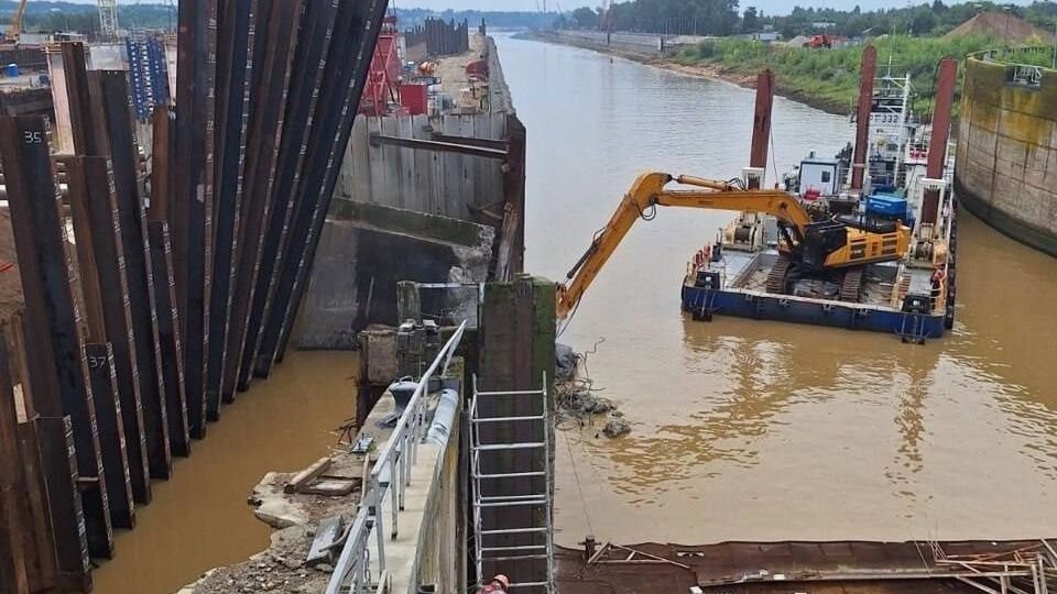 Напомним, что 22 июля при строительных работах 22 июля накренилась бетонная перемычка между шлюзами №15 и №16, камеру затопило. Специалисты обеспечены всей необходимой техникой и материалами для устранения последствий аварии. Ведутся работы.