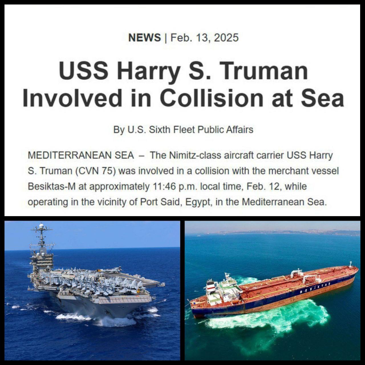 Сегодня мир чудом избежал ядерной катастрофы. Пентагон сообщил что авианосец USS Harry S. Truman столкнулся с панамским сухогрузом у берегов Египта.