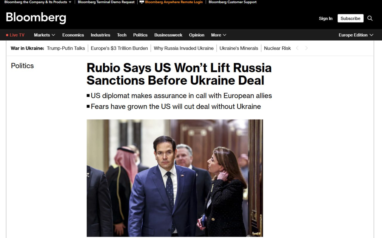 Госсекретарь США Макро Рубио заверил европейских партнеров, что санкции против России будут действовать как минимум до момента достижения мирного урегулирования конфликта на Украине, - передает его слова