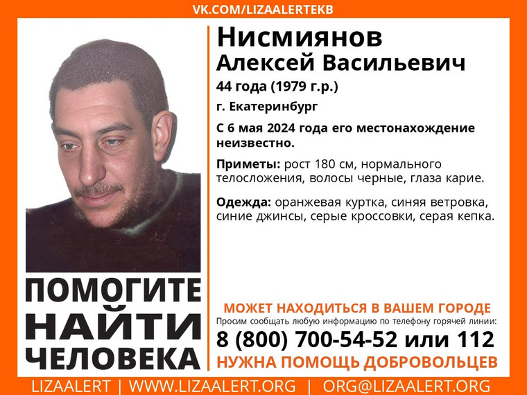 «Помогите найти человека! Пропал Нисмиянов Алексей Васильевич, 44 года (1979 г. р.), город Екатеринбург. С 6 мая 2024 года его местонахождение неизвестно. Может находиться в вашем городе… Нужна помощь добровольцев», — написали волонтеры в группе отряда «ВКонтакте».