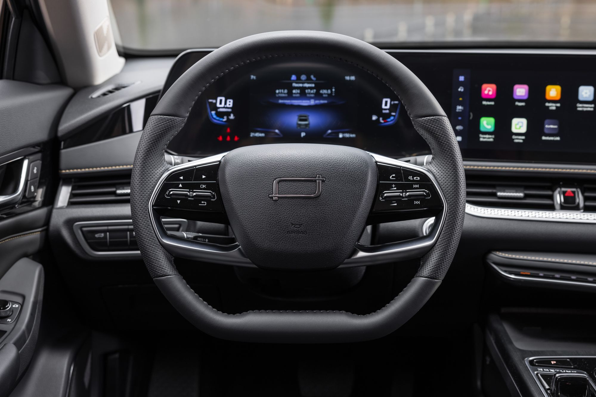 D-образное рулевое колесо с двойными спицами как показалось неудобным на статической презентации, так, увы, и оправдало эти опасения на ходу. С дизайном сильно перемудрили – нормально держать руль можно только хватом «10-2», поскольку взять его хоть как-нибудь по-другому мешают спицы. Просто посмотрите на фото, насколько значительную часть обода они попросту «съедают»! Да ещё и руль настраивается только по высоте – регулировки по вылету нет. Впрочем, подобрать удобную посадку удалось и без этого, а вот отсутствие подогрева вряд ли кого-то обрадует. Кнопки на руле – аналоговые, никаких сенсоров или тачпадов.