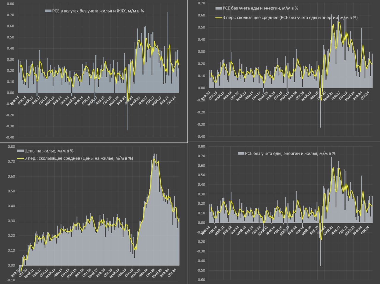 Пик инфляционного воздействия по жилью был в середине 2022 на уровне 0.75% и в среднем 0.72% по трехмесячному импульсу, нормализация началась с весны 2023, а к началу 2025 по трехмесячной средней (0.29%) почти вернулись в приемлемый диапазон 0.25-0.3%, который наблюдался в период с 2015 по 2019.
