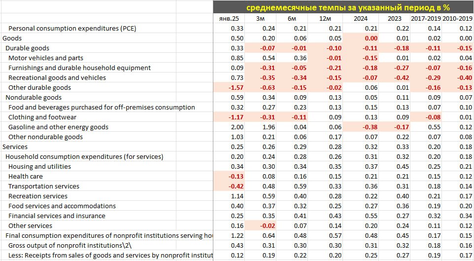 Данные плохие. Широкий индекс цен по PCE вырос на 0.33% м/м в январе – это максимальный рост с мар.24, но чуть лучше, чем в янв.24 (0.42%), за три месяца – 0.24%, за полгода – 0.21%, за последние 12 месяцев – 0.21%, тогда как среднесрочная норма (2017-2019) составила 0.14%, а долгосрочная норма (2010-2019) около 0.12%.
