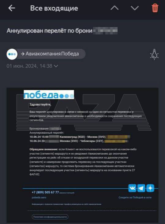 Все шло как обычно, до Калининграда семья добралась хорошо, но потом начались проблемы. В зоне выдачи багажа девушка обнаружила только чемодан ребенка, ее вещи не прилетели. В процессе поисков Ксения узнала, что ее багаж остался в Шереметьево – якобы она не явилась на рейс до Калининграда. А еще за «неявку» «Победа» аннулировала обратные билеты Ксении, о чем девушка получила письмо на электронную почту.