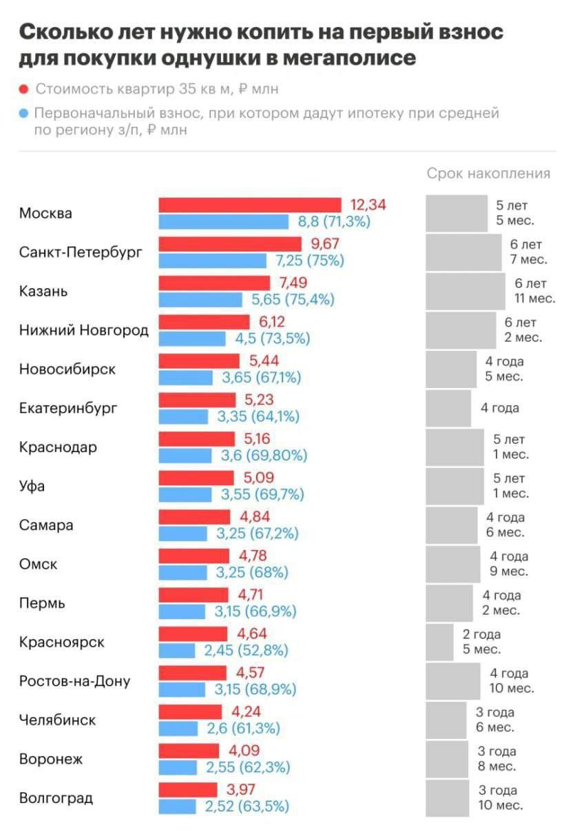 Первоначальный взнос по ипотеке в России вырос до 70% от суммы жилья, подсчитали в РБК. При этом банки говорят о минимальных требованиях к первому взносу по ипотеке — 20%. При средних зарплатах получить кредит с низким взносом не получится, в миллионниках надо накопить более половины от стоимости квартиры. Например, в Нижнем Новгороде, чтобы взять однушку, нужно отдать 73% стоимости сразу — это 4,5 млн рублей. Накопить такую сумму получится, если откладывать всю зарплату 6 лет. @banksta
