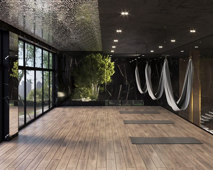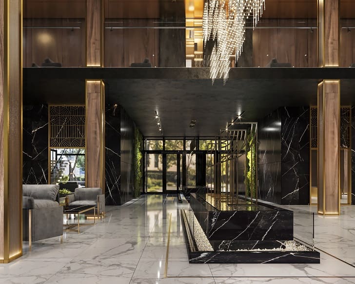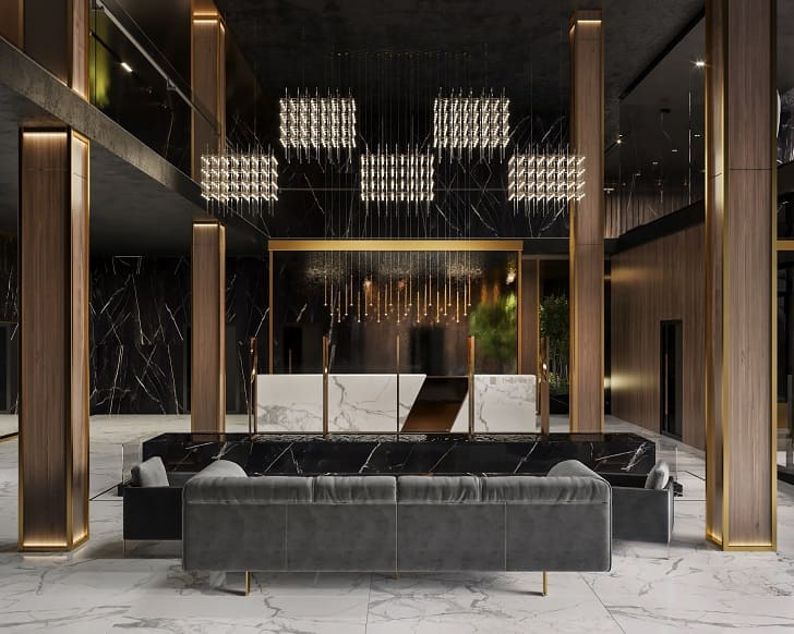 Архитектурная концепция представляет собой сочетание двух жилых секций, объединенных впечатляющей входной группой с ресепшеном. Из просторного холла площадью 900 м², где расположены фонтан, стена с имитацией водопада и зона отдыха, можно попасть как в правое, так и в левое крыло здания.