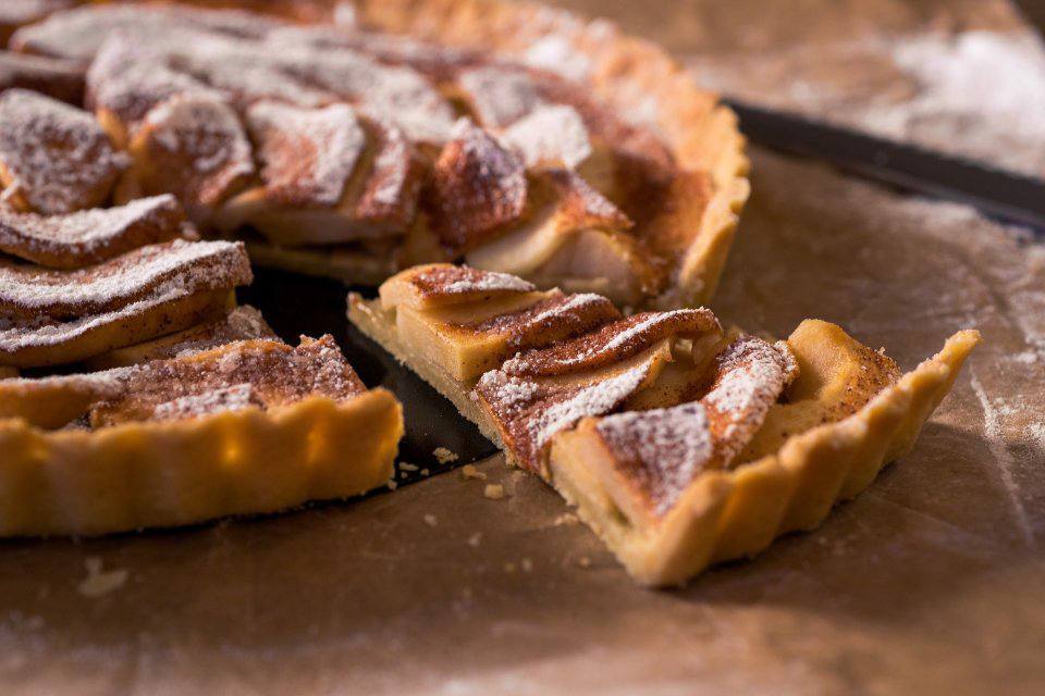 7. Выложить яблочные дольки. Посыпать сахаром и корицей. Сверху выложить кусочки сливочного масла.