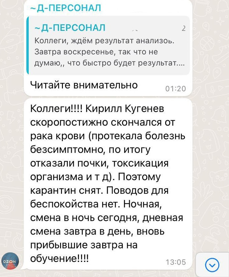 Семью умершего парня возмутило то, что менеджер Ozon в рабочем чате распространял информацию о том, что у Кирилла был рак крови. Отец опроверг информацию об этом и предоставил справку о смерти.
