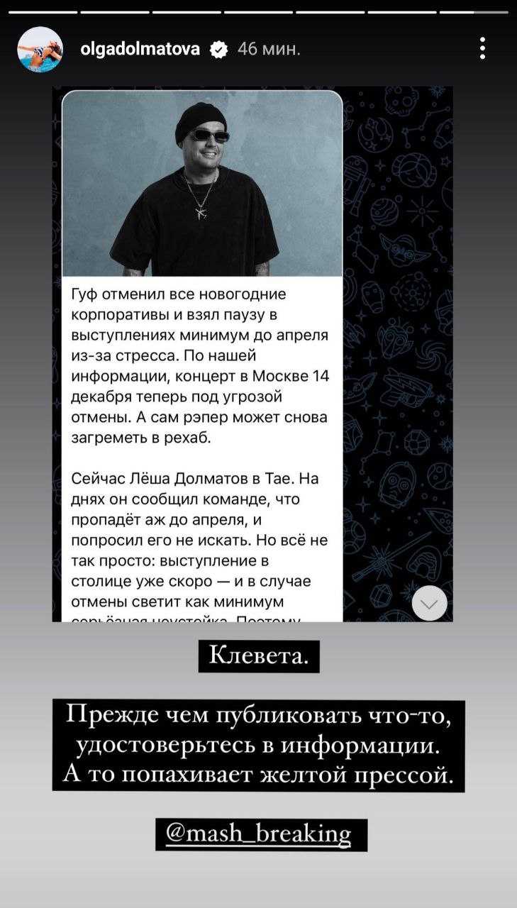 Сестра Гуфа Ольга опровергает новость об отмене концерта рэпера — говорит, что Алик Алексей не собирается до апреля пропадать со сцены.