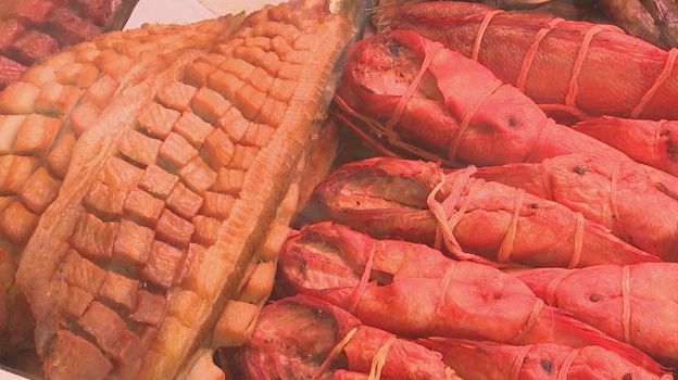 Есть слабосолёная, горячего и холодного копчения. Здесь же на прилавках рассыпчатая красная икра с высоким содержанием белка. А для настоящих гурманов печень трески. Кстати, все полезные микроэлементы и качество продукции сохраняется благодаря перевозке в охлажденном виде.