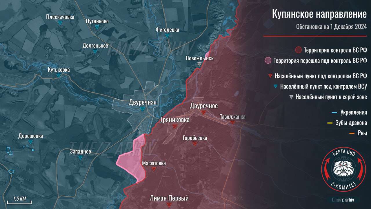 1. Подразделения ВС РФ расширяют плацдарм на берегу р. Оскол, к югу от Двуречной. Ранее были продвижения северо-восточнее у Новомлынска. Постепенно формируется угроза Двуречной.