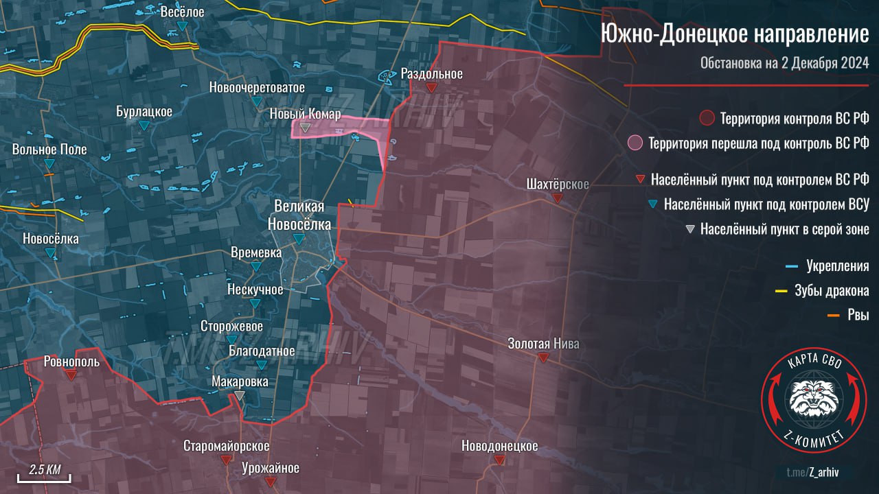 2. ВС РФ продвигаются юго-западнее Раздольного. Противник признает фактическую утрату контроля над Новым Комаром. Угроза охвата Великой Новоселки стала реальностью.