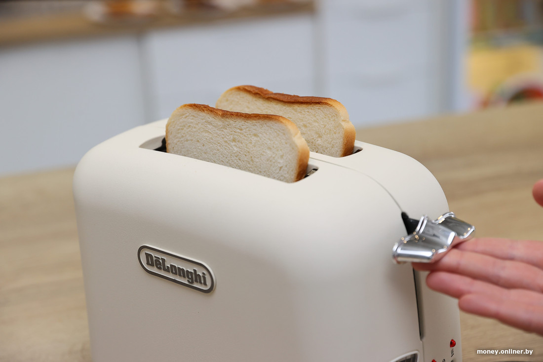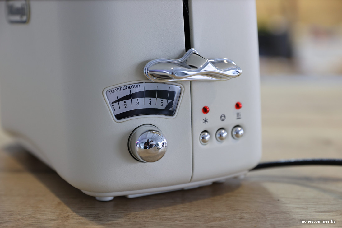 У этой модели DeLonghi мощность составляет 800 ватт, цена на момент публикации — от 279 рублей. Тостер выглядит крепким, добротным. Мы восхитились внешним видом. Во-первых, необычный цвет — нежно-молочный. Во-вторых, элементы дизайна: забавная стрелочка для установки степени прожарки (всего степеней шесть), приятные выпуклые кнопочки.