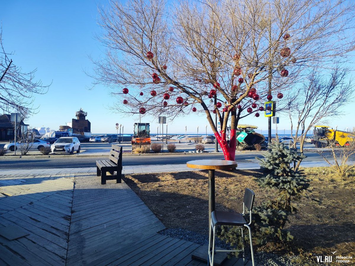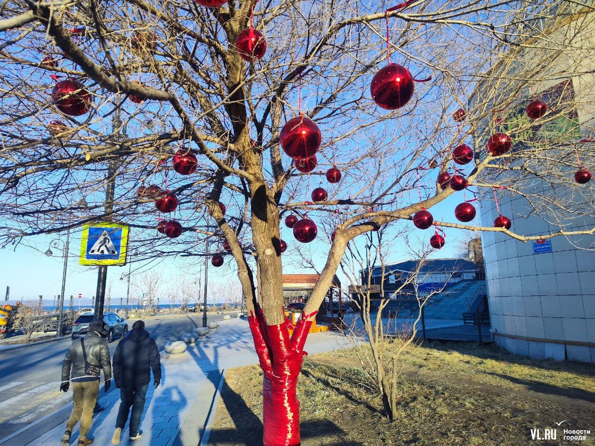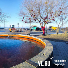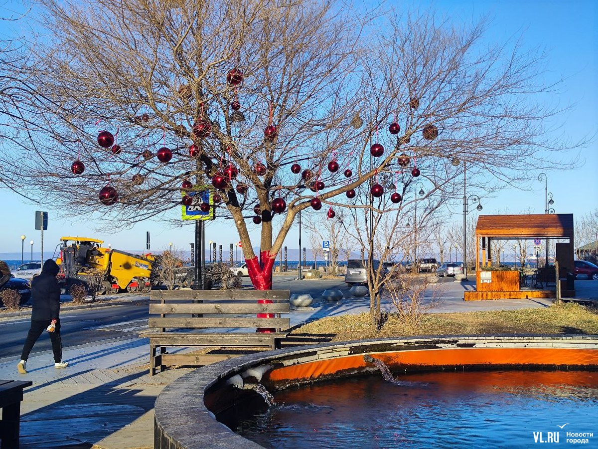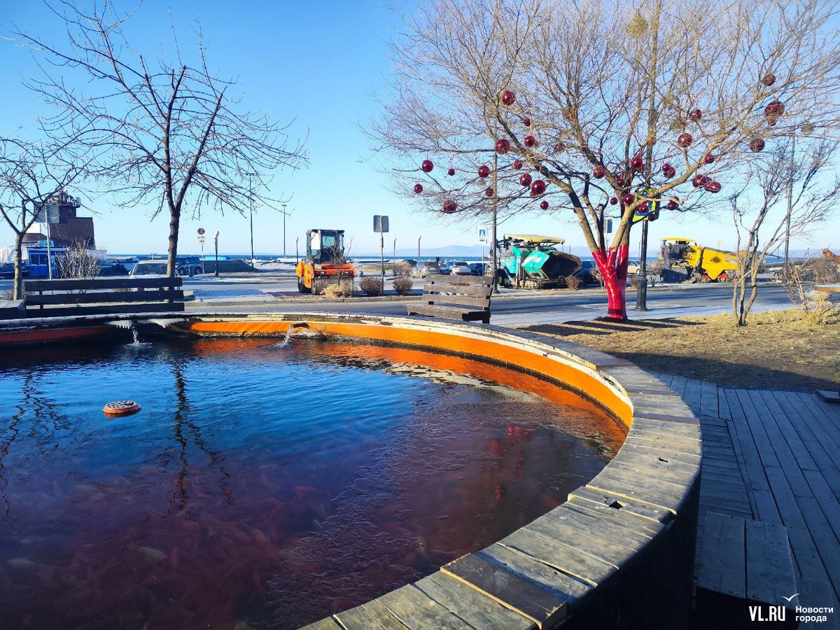 Уголок набережной на улице Батарейной в районе Владивостокского океанариума, где недавно открыли беседку с навесом, стал ещё уютнее. Здесь с помощью красных лент и огромных шаров украсили дерево, которое раскинуло свои ветви над бассейном с японскими карпами. Рыбки, кстати, всё ещё остаются в водоёме, несмотря на то, что он уже начал покрываться льдом. Владельцы рыб говорят, что заберут их на зимовку позже.