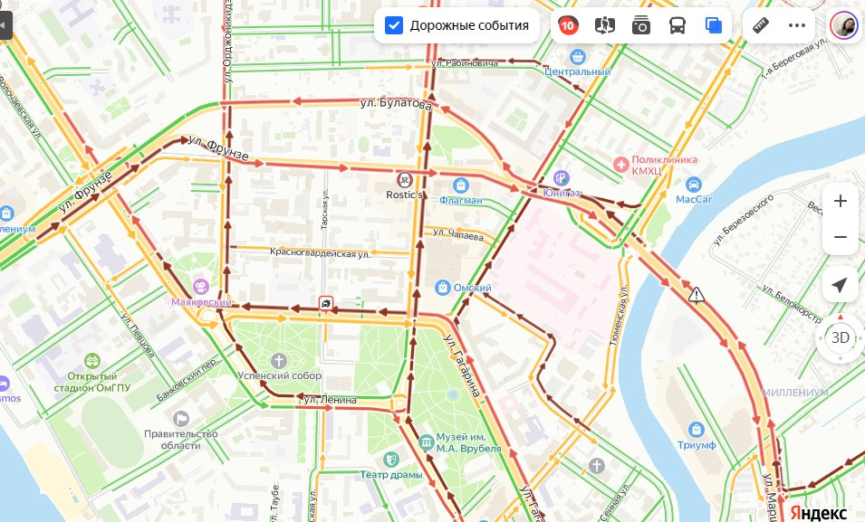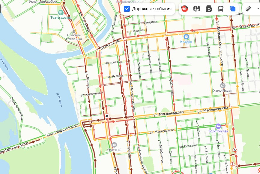 К вечеру 6 декабря в Омске пробки достигли 10 баллов. По сервису Яндекс.Карты, самые загруженные улицы сейчас в центре. Это улицы Интернациональная, Орджоникидзе, Красный Путь, Фрунзе, Герцена, Больничный переулок и Думская. В сторону Жукова тоже пробки: стоит транспорт на дорогах у Ленинградской площади, на Маяковского, Карла Маркса и Пушкина.