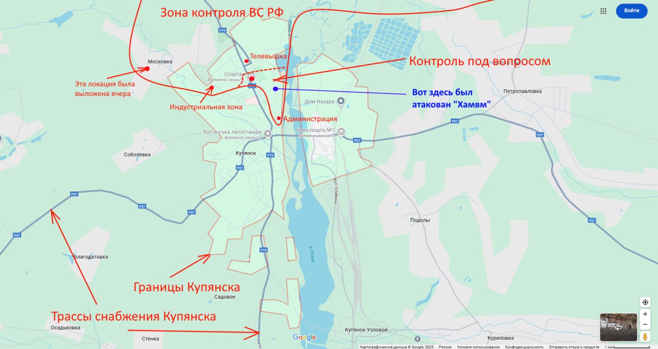 Причем, в видео, которое было размещено (отдельно его репощу), подборка ударов наших дронов и авиации по противнику в Купянске. И если отбросить бомбовый удар в конце ролика (который о контроле ничего нам сказать не может кроме того, что место удара под противником), то в нем есть ТОЛЬКО ОДНА ЧЕТКАЯ ЛОКАЦИЯ (не считая ночных ударов), где наш дрон на оптике поразил вражеский «Хамви».