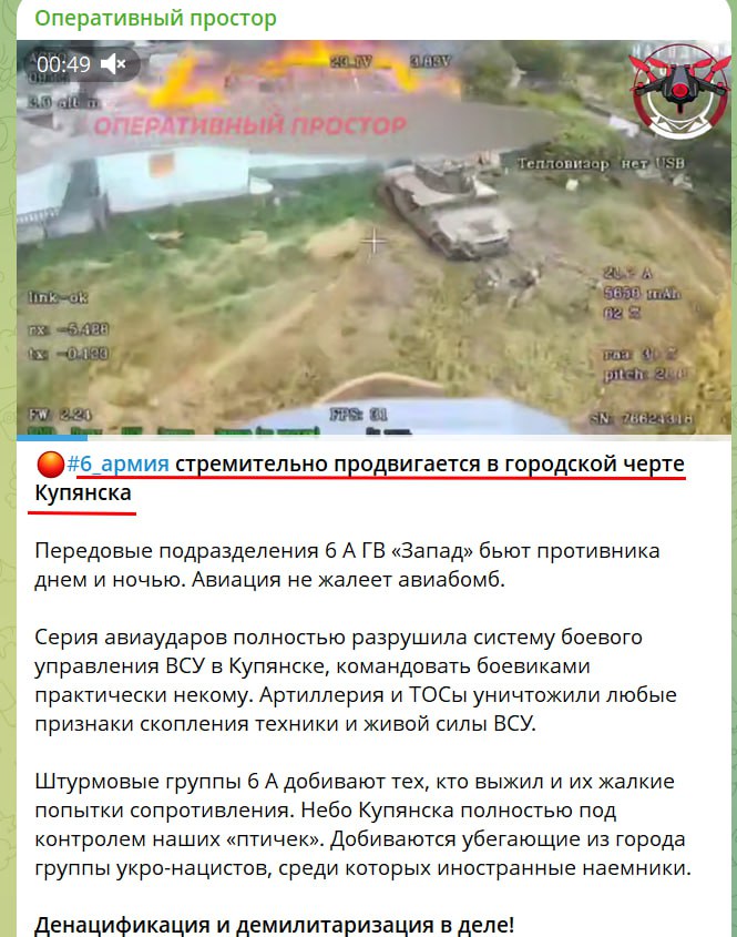 Итак, на канале «Оперативный простор», который как несложно убедиться, как раз специализируется на описании боев в полосе группировки «Запад» (как я понимаю их т. н. «карманный канал»), появился материал с видео (скрин 1, кстати, в комментариях к видео можете админам канала задать вопросы - "как так"?), с многозначительным названием «6 армия стремительно продвигается в городской черте Купянска». Материал явно идет в продолжение темы спора и естественно описывает события последних дней.
