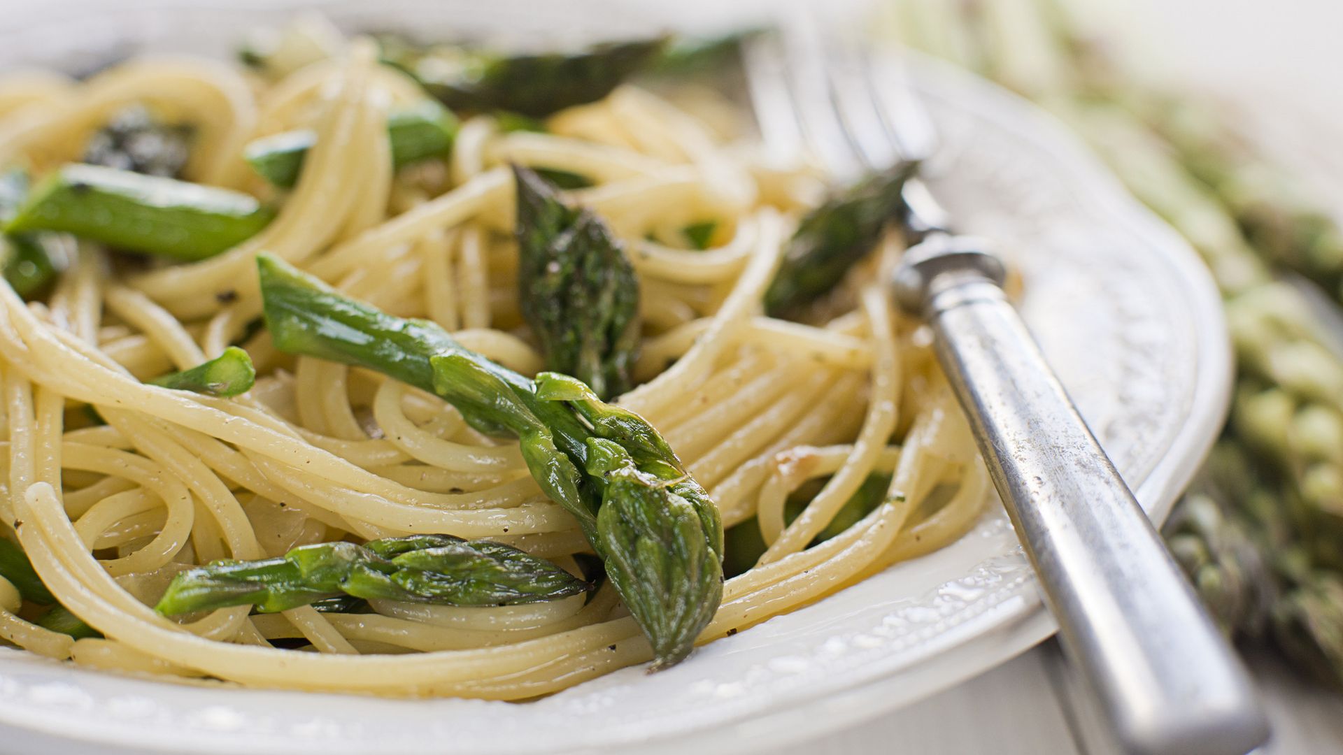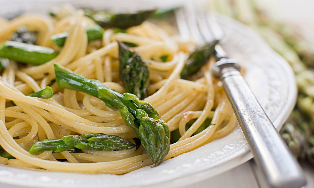 Готовые спагетти выложите в сковороду со спаржей, луком и чесноком. Тщательно перемешайте. Убавьте огонь, посыпьте пармезаном и добавьте сливочное масло. Еще раз перемешайте и снимите с огня.