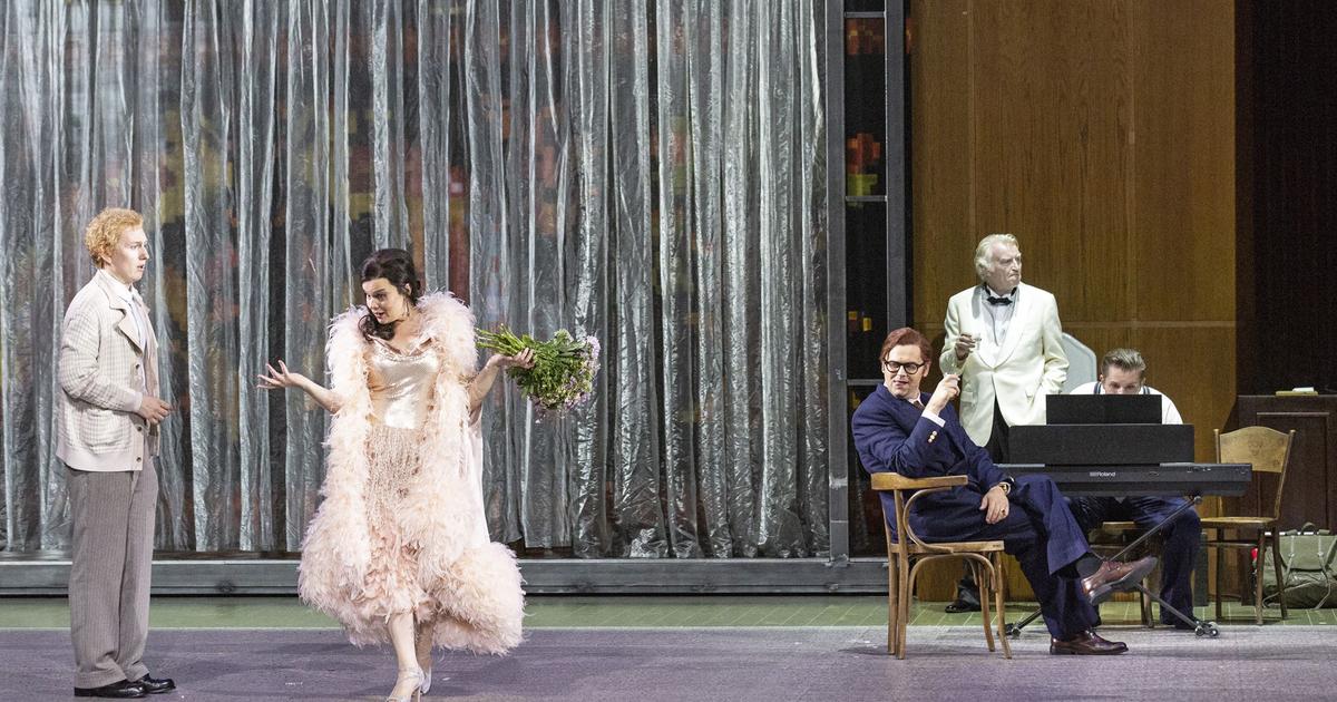 (à gauche), en Prince Mychkine, donne la réplique à Ausrine Stundyte, dont le soprano rauque traduit les blessures de Nastassia, dans L’Idiot, de Mieczyslaw Weinberg, au Festival de Salzbourg. © SF/Bernd Uhlig