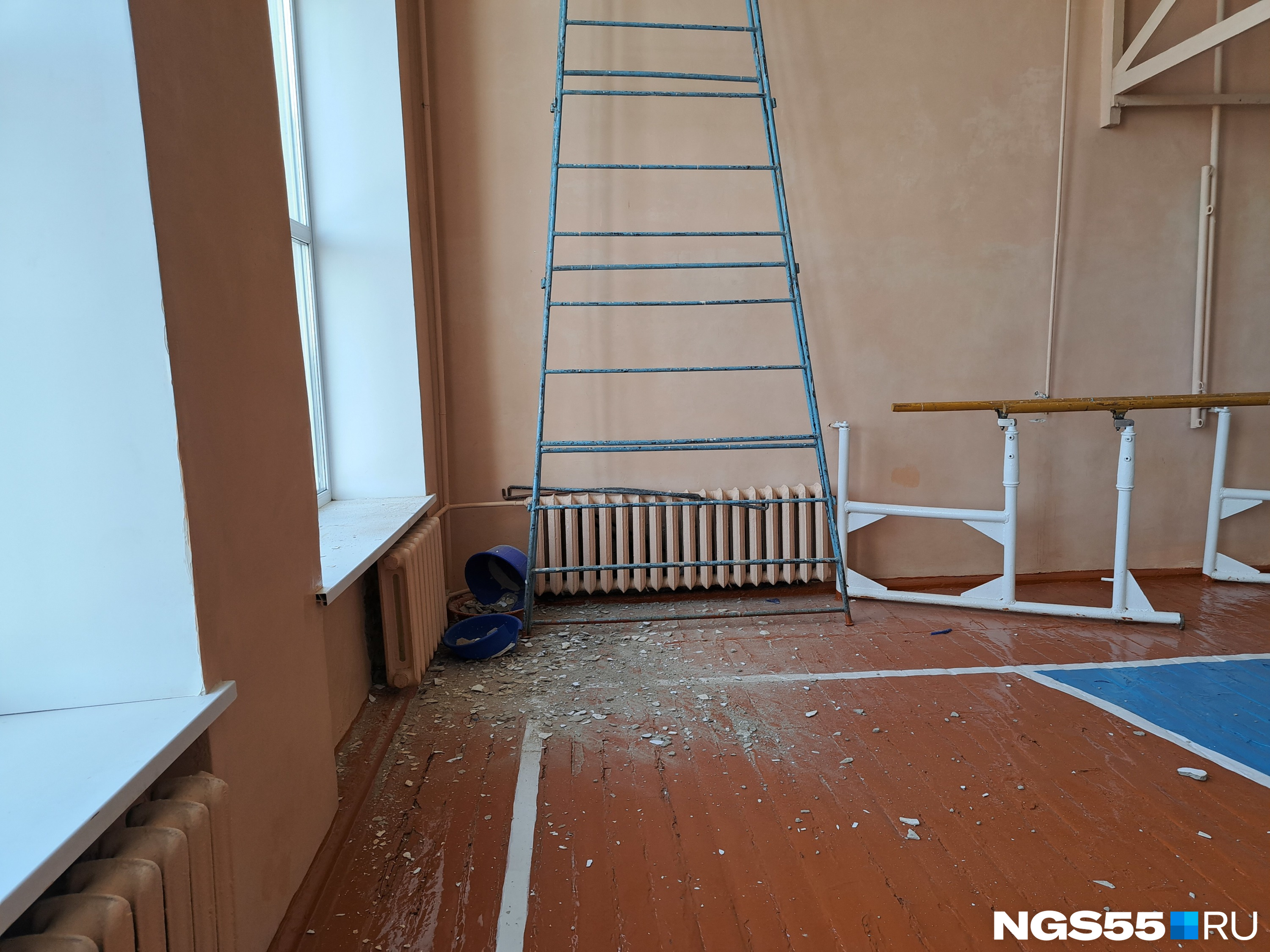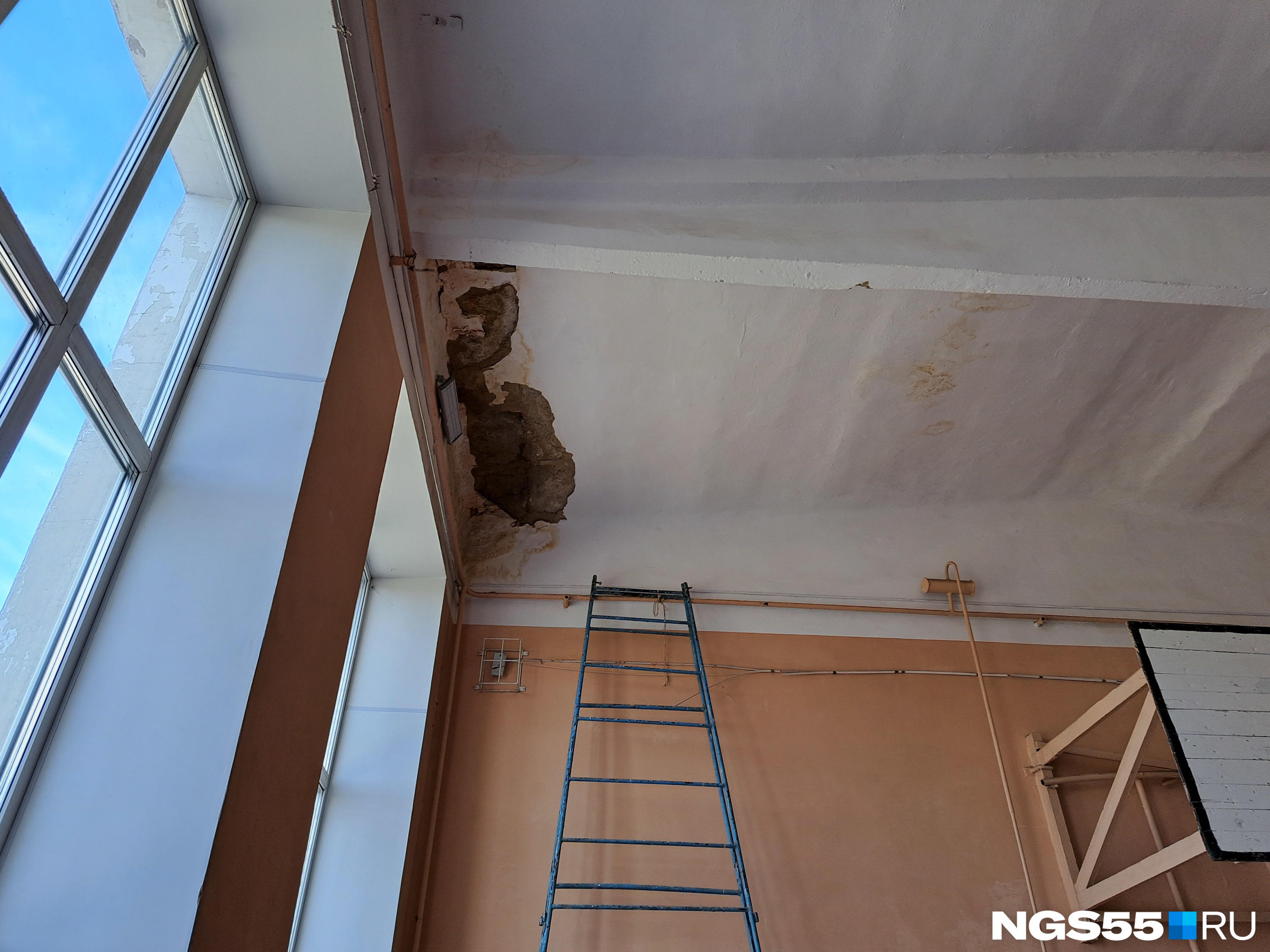 Далее рейд продолжился. Мы зашли в старенькую, но уютную столовую, где может поместиться всего 90 человек, а потом отправились смотреть боль этого здания — спортзал. Здесь нашему взгляду открылась протекающая крыша и мусор в углу зала.