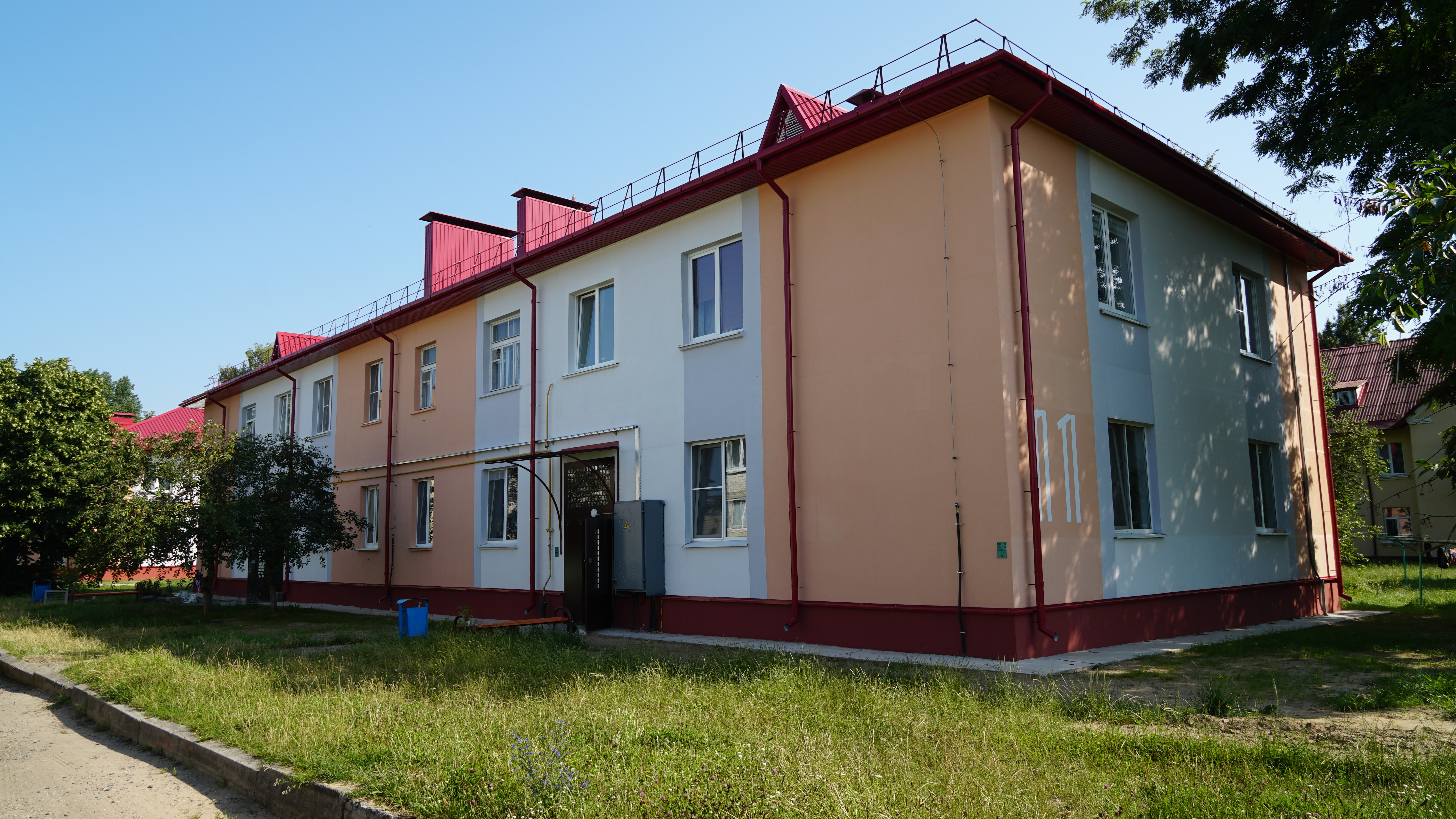 В ходе ремонта с элементами модернизации в двухэтажных жилых домах была произведена замена стояков горячей и холодной воды, над подъездами появились козырьки, а в подъездах – новые светильники, окна и двери. Теперь вместо шифера кровлю украшает новая металлочерепица, оборудованы водостоки. И, конечно, преобразились сами фасады, кирпичная кладка которых оштукатурена и покрашена. Кроме того, в отремонтированных домах установлены общие счетчики на потребление тепла. Стоимость строительно-монтажных работ (без учета проекта и оборудования) составила чуть более 600 тысяч белорусских рублей. Строительные работы велись специалистами ОАО «Строительно-монтажный трест №19».