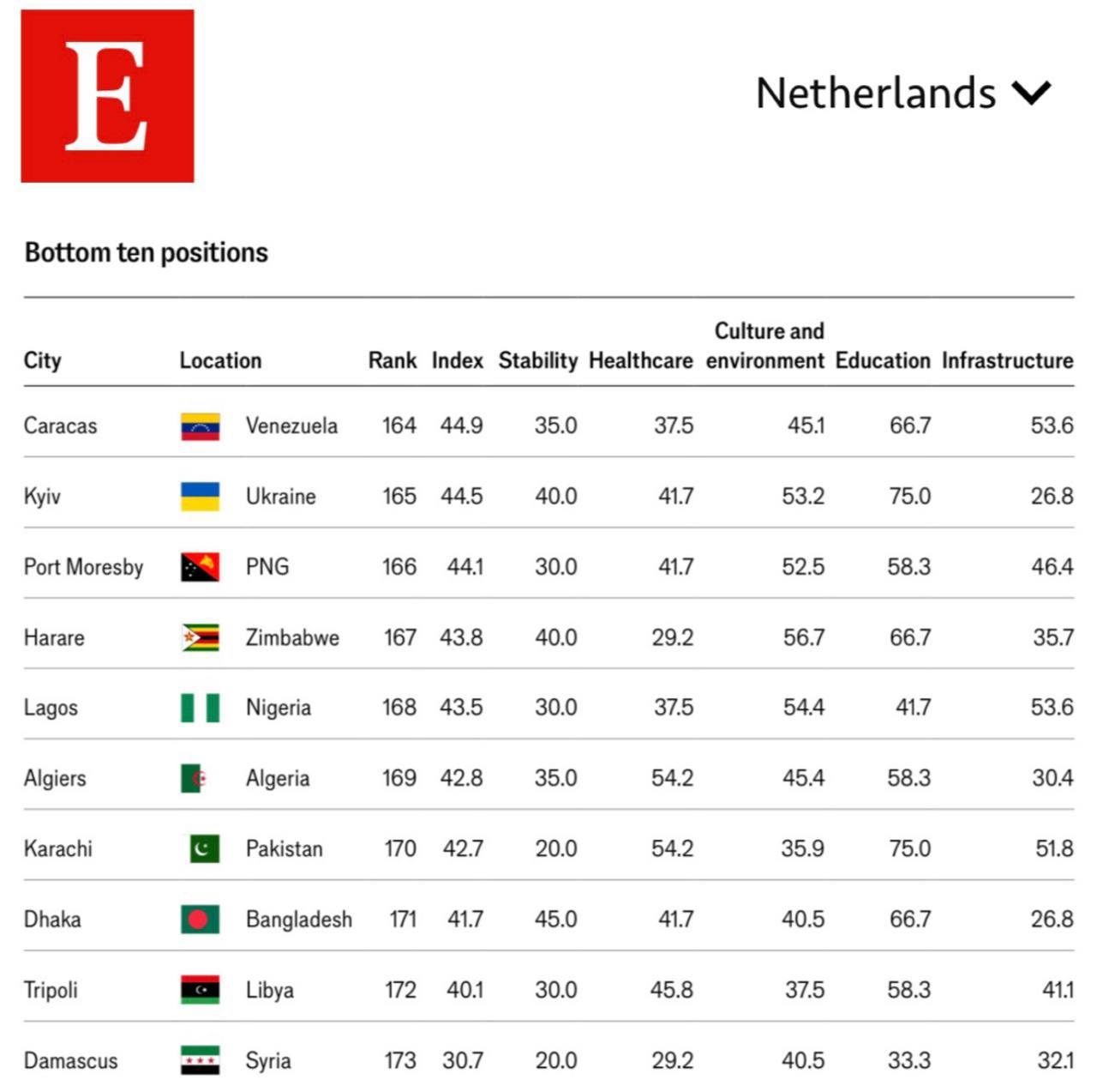 Меньше всего балов получил «демократический» Дамаск - 173 е место.