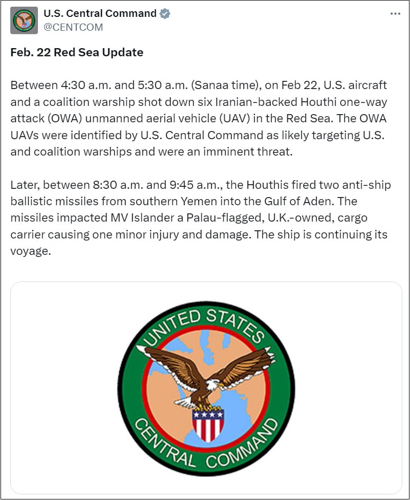 Центральное командование США (CENTCOM) подтверждает ракетную атаку по судну ISLANDER в Красном море, а также сообщает о попытке хуситов ударить по американскому военному кораблю.