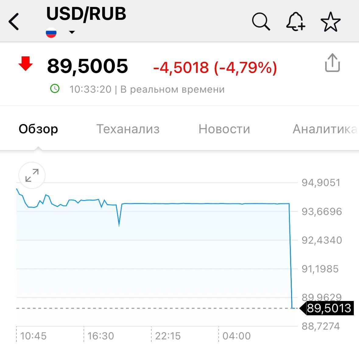 Доллар упал на 5% на бирже. Теперь он торгуется у отметки 89,5 рублей. Евро — у 95,6.