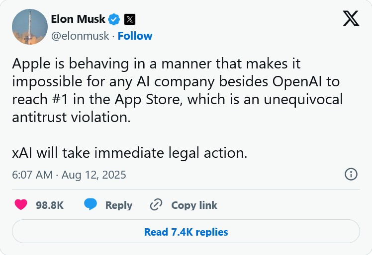 Apple ведет себя таким образом, что делает невозможным для любой ИИ-компании, кроме OpenAI, занять первое место в App Store, что представляет собой недвусмысленное нарушение антимонопольного законодательства. xAI предпримет немедленные юридические действия.