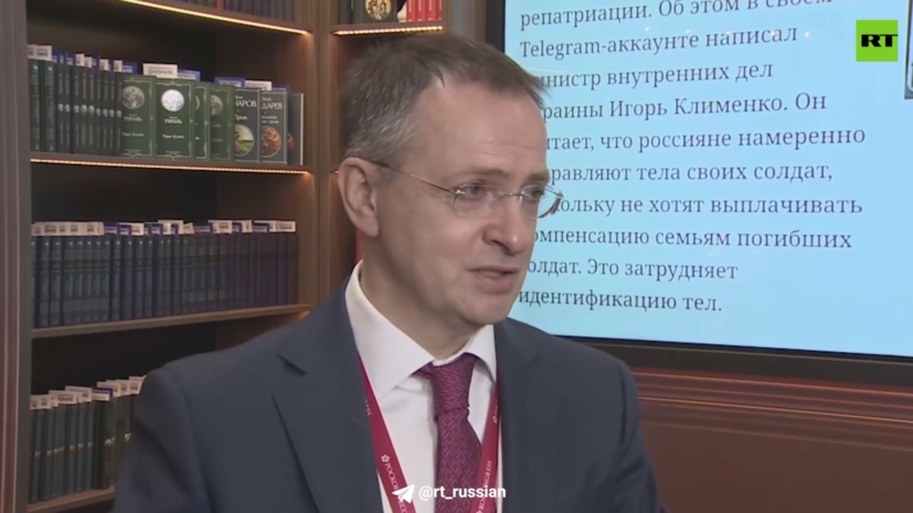 Кадры опубликованы в Telegram-канале RT. Мединский привёл в пример случай, когда Украина представила тело одного солдата с чудом сохранившимся военным билетом советского образца, которых сейчас почти нет.