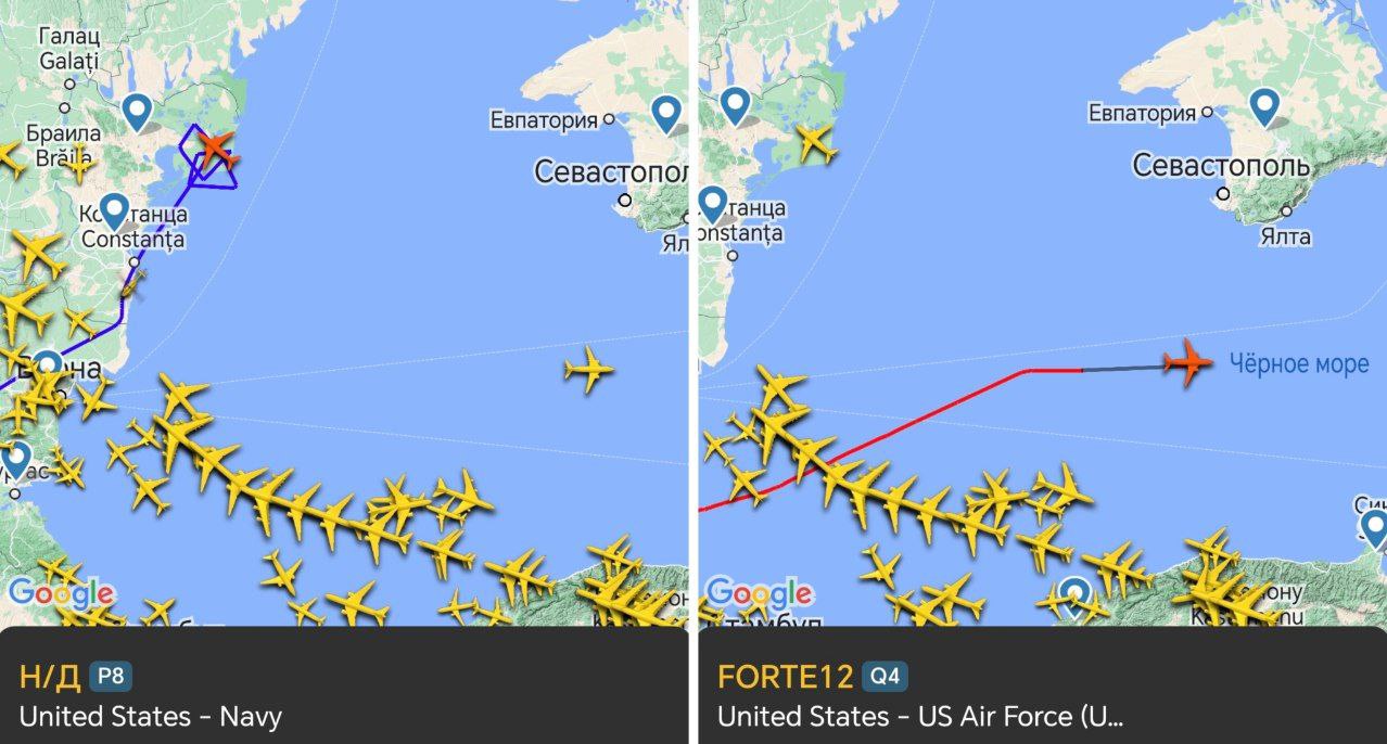 Также к западу от Крыма начал работу разведывательный самолёт Boeing P-8A Poseidon ВМС США.