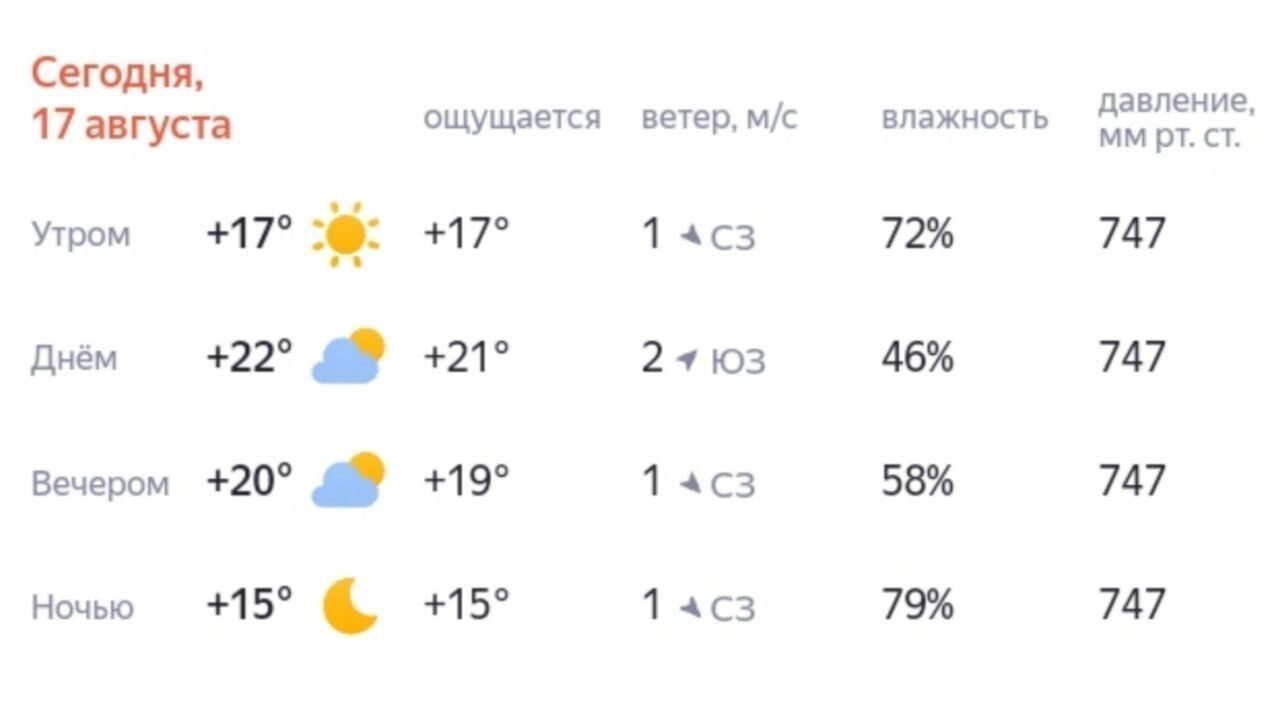 В воскресенье, 17 августа, средняя температура в Югре составит +19…+20 градусов днем, и +9…+14 градусов ночью. Также прогнозируют грозы с дождем и туман. Ветер — юго-западный, 7-12 м/с. В ночное время должен быть штиль.