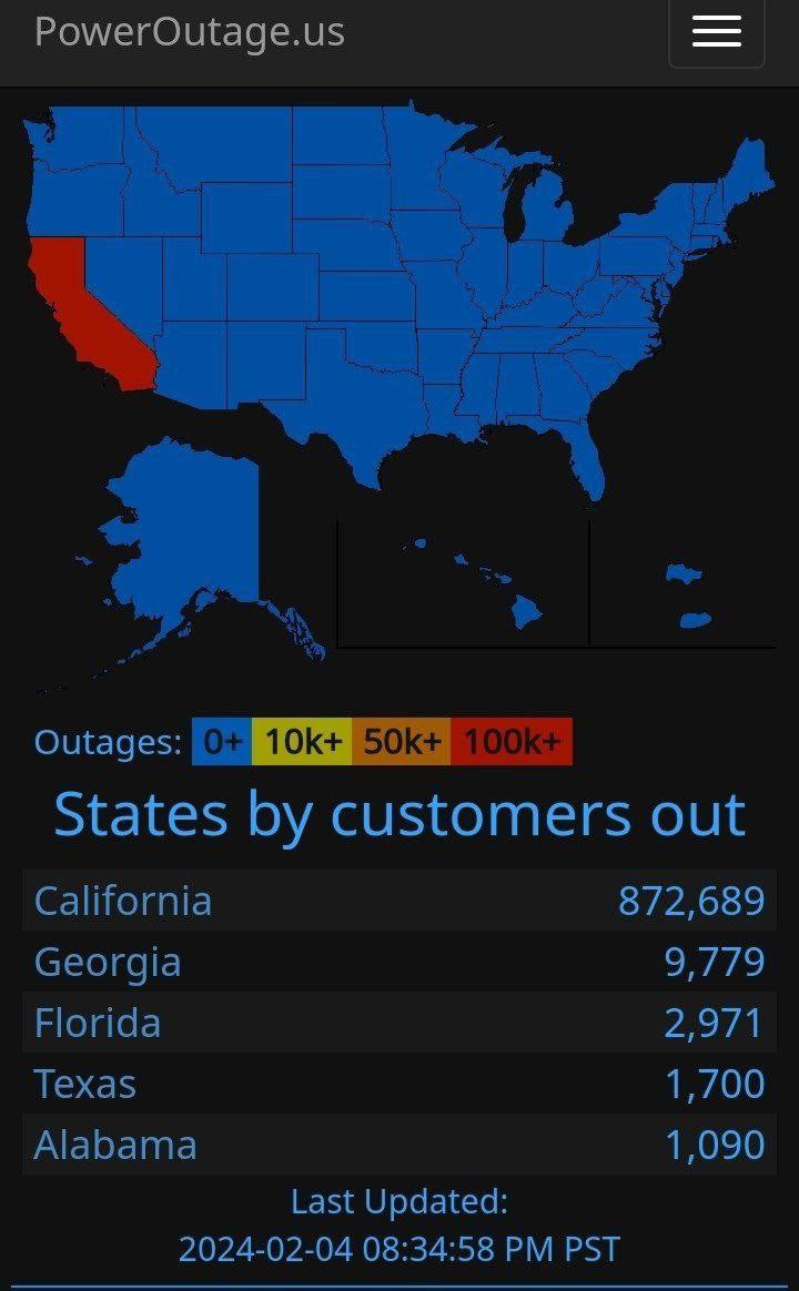В то время, как редкий и смертоносный шторм угрожает американскому штату Калифорния наводнениями, почти 1 миллион человек там остаются без электричества.
