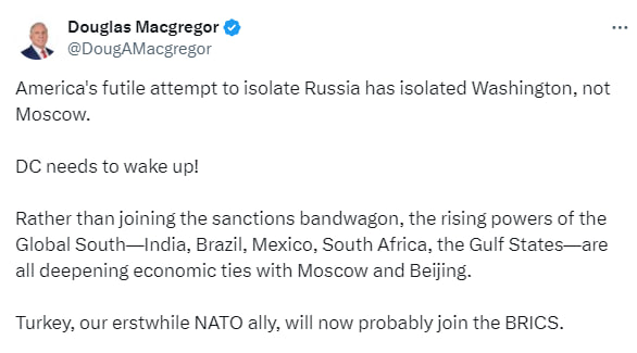 Глобальный Юг – Индия, Бразилия, Мексика, Южная Африка, страны Персидского залива – не хочет примкнуть к санкционному стаду, а укрепляет экономические связи с Москвой и Пекином, отметил бывший советник главы Пентагона Дуглас Макгрегор на своей странице в соцсети.