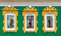 5. В Ярославской области (например, в городе Мышкине) наличники на окнах красят в три, а то и в четыре цвета! Украшают их многослойным навершием: вырезают несколько досок и накладывают их друг на друга, формируя нависающий объем.