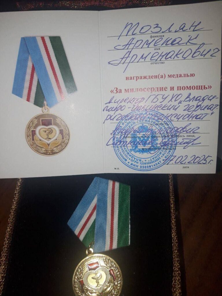 На постоянной основе помогает Арменак Тозлян и мирным жителям, находящимся в зоне ведения боевых действий. В благодарность за оказываемую поддержку директор гериатрического пансионата из Херсонской области передал парламентарию медаль «За милосердие и помощь».