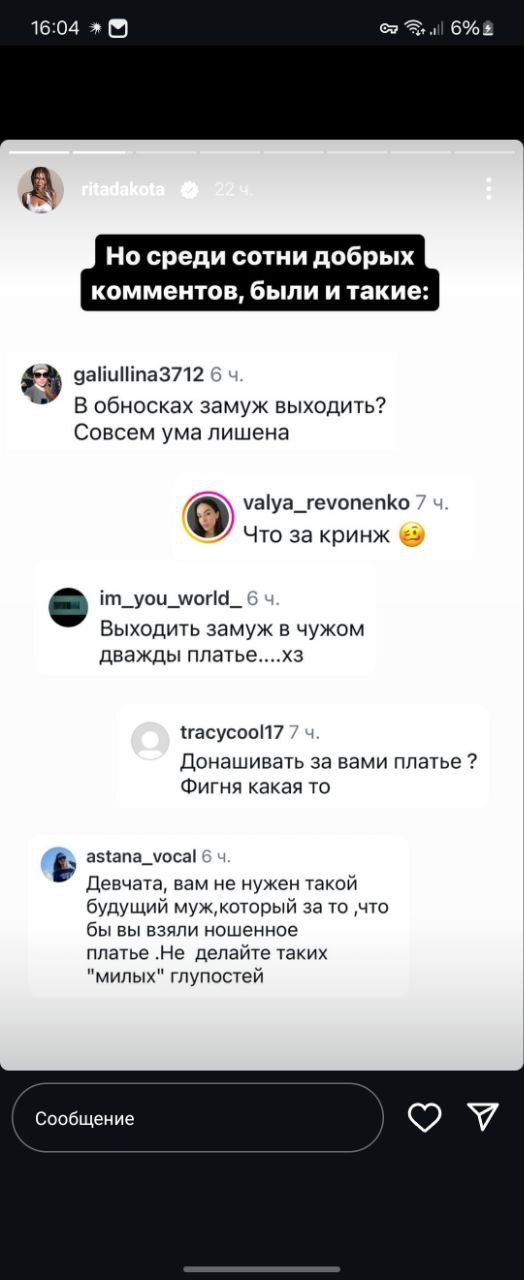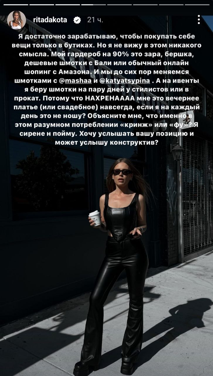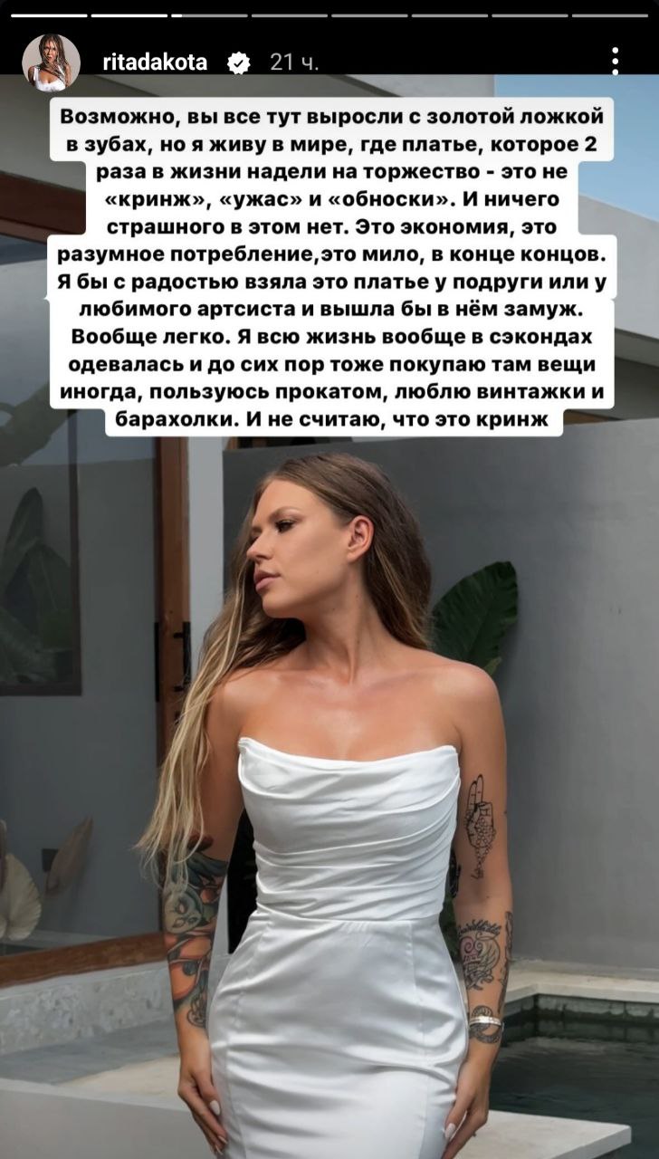 Рита Дакота раздает недовольным: на этот раз пострадали те, кто не оценил порыв певицы вновь отдать любому желающему на Бали свое свадебное платье — первый раз наряд вернули за ненадобностью после торжества. От артистки сразу пошли речи про ответственное потребление и про то, что сама певица, несмотря на все возможности, легко и часто затаривается в секондах и массмаркете. Верим?
