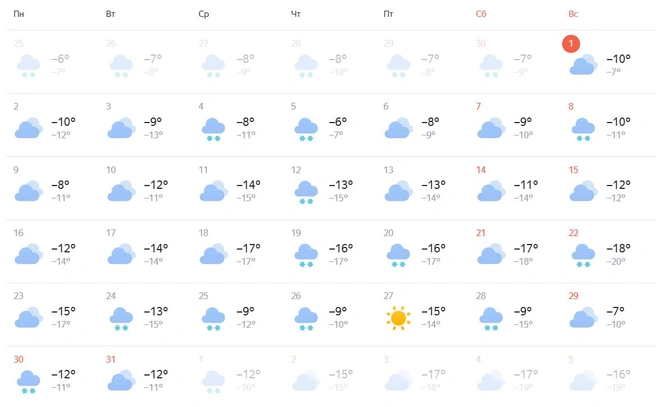 Прогноз World Weather чуть холоднее, сервис сообщает о похолодании до -28 градусов в январе. Правда, 8 января и 14 января прогнозируют потепление до +1 градуса.