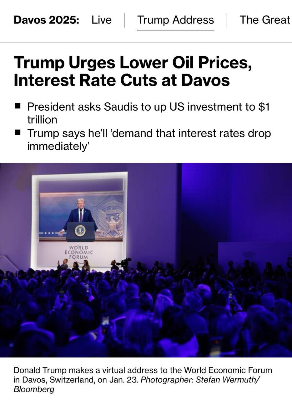 Трамп в Давосе распорядился, чтоб все снизили стоимость барреля нефти и сказал, чтоб саудовцы инвестировали в США триллион бакинских.