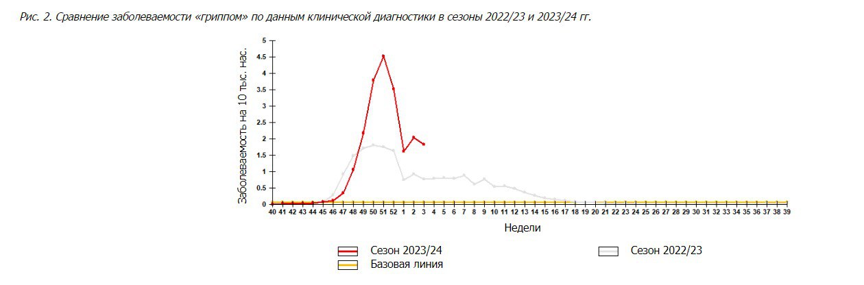 На 3-й неделе 2024 года уровень суммарной заболеваемости населения гриппом и другими ОРВИ понизился, по сравнению с предыдущей неделей, но всё ещё был выше базовой линии на 15% и выше еженедельного эпидемического порога на 32,2%, по данным НИИ гриппа им.Смородинцева.