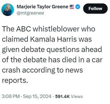 Сотрудник телекомпании ABC, который утверждал, что команда Камалы Харрис заранее направила список вопросов перед дебатами с Трампом, погиб в автокатастрофе. Сообщила конгрессменша от республиканцев Марджори Тейлор Грин.